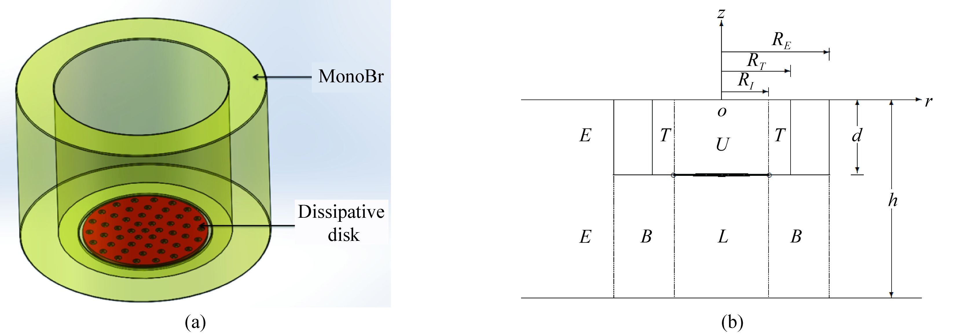 This paper adopted a semi-analytical method based on eigenfunction matching to solve the problem of sharp resonance of cylindrical structures with a moonpool that has a restricted entrance. To eliminate the sharp resonance and to measure the viscous effect, a quadratic dissipation is introduced by assuming an additional dissipative disk at the moonpool entrance. The fluid domain is divided into five cylindrical subdomains, and the velocity potential in each subdomain is obtained by meeting the Laplace equation as well as the boundary conditions. The free-surface elevation at the center of the moonpool, along with the pressure and velocity at the restricted entrance for first-order wave are evaluated. By choosing appropriate dissipation coefficients, the free-surface elevation calculated at the center of the moonpool is in coincidence with the measurements in model tests both at the peak period and amplitude at resonance. It is shown that the sharp resonance in the potential flow theory can be eliminated and the viscous effect can be estimated with a simple method in some provided hydrodynamic models.