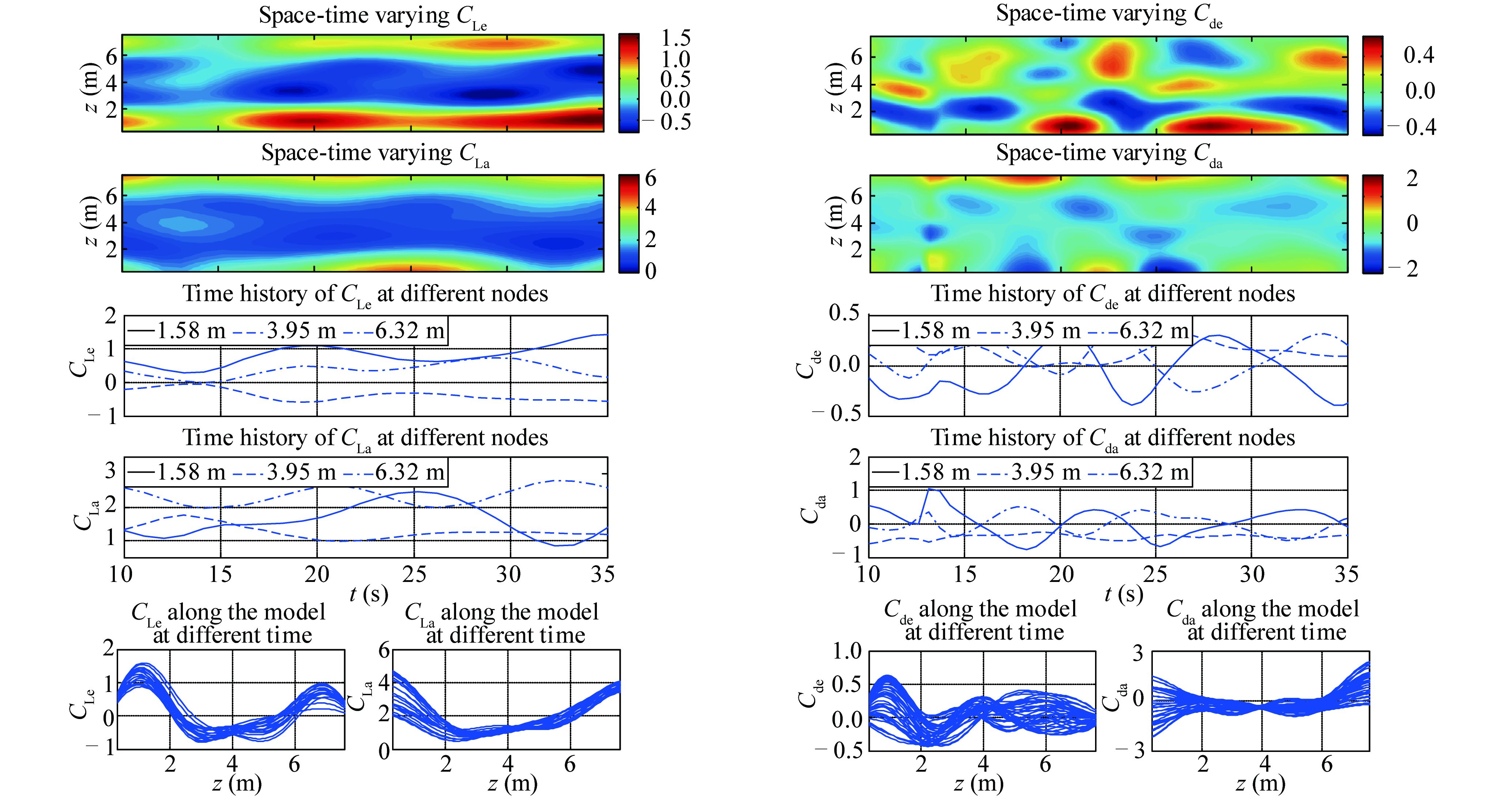 This study proposed a method to obtain hydrodynamic forces and coefficients for a flexible riser undergoing the vortex-induced vibration (VIV), based on the measured strains collected from the scale-model testing with the Reynolds numbers ranging from 1.34E5 to 2.35E5. The riser is approximated as a tensioned spatial beam, and an inverse method based on the FEM of spatial beam is adopted for the calculation of hydrodynamic forces in the cross flow (CF) and inline (IL) directions. The drag coefficients and vortex-induced force coefficients are obtained through the Fourier Series Theory. Finally, the hydrodynamic characteristics of a flexible riser model undergoing the VIV in a uniform flow are carefully investigated. The results indicate that the VIV amplifies the drag coefficient, and the drag coefficient does not change with time when the CF VIV is stable. Only when the VIVs in the CF and IL directions are all steady vibrations, the vortex-induced force coefficients keep as a constant with time, and under " lock-in” condition, whether the added-mass coefficient changes with time or not, the oscillation frequency of the VIV keeps unchanged. It further shows that the CF excitation coefficients at high frequency are much smaller than those at the dominant frequency, while, the IL excitation coefficients are in the same range. The axial distributions of the excitation and damping region at the dominant frequency and high frequency are approximately consistent in the CF direction, while, in the IL direction, there exists a great difference.