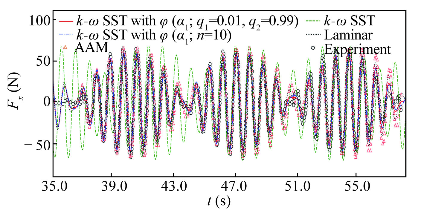 Reynolds-averaged Navier−Stokes (RANS) turbulence modeling can lead to the excessive turbulence level around the interface in two-phase flow, which causes the unphysical motion of the interface in sloshing simulation. In order to avoid the unphysical motion of the interface, a novel eddy-viscosity eliminator based on sigmoid functions is designed to reduce the excessive turbulence level, and the eddy-viscosity eliminator based on polynomials is extracted from the cavitation simulations. Surface elevations by combining the eddy-viscosity eliminators and classical two-equation closure models are compared with the experiments, the ones by using the adaptive asymptotic model (AAM) and the ones by using the modified two-equation closure models. The root-mean-squared error (RMSE) is introduced to quantify the accuracies of surface elevations and the forces. The relation between the turbulence level in the transition layer and RMSEs of surface elevations is studied. Besides, the parametric analysis of the eddy-viscosity eliminators is carried out. The studies suggest that (1) the excessive turbulence level in the transition layer around the interface has a significant influence on the accuracies of surface elevations and the forces; (2) the eddy-viscosity eliminators can effectively reduce the excessive turbulence level in the transition layer to avoid the unphysical motion of the interface; (3) the\begin{document}$k - {\textit{ω}} $\end{document} ![]()