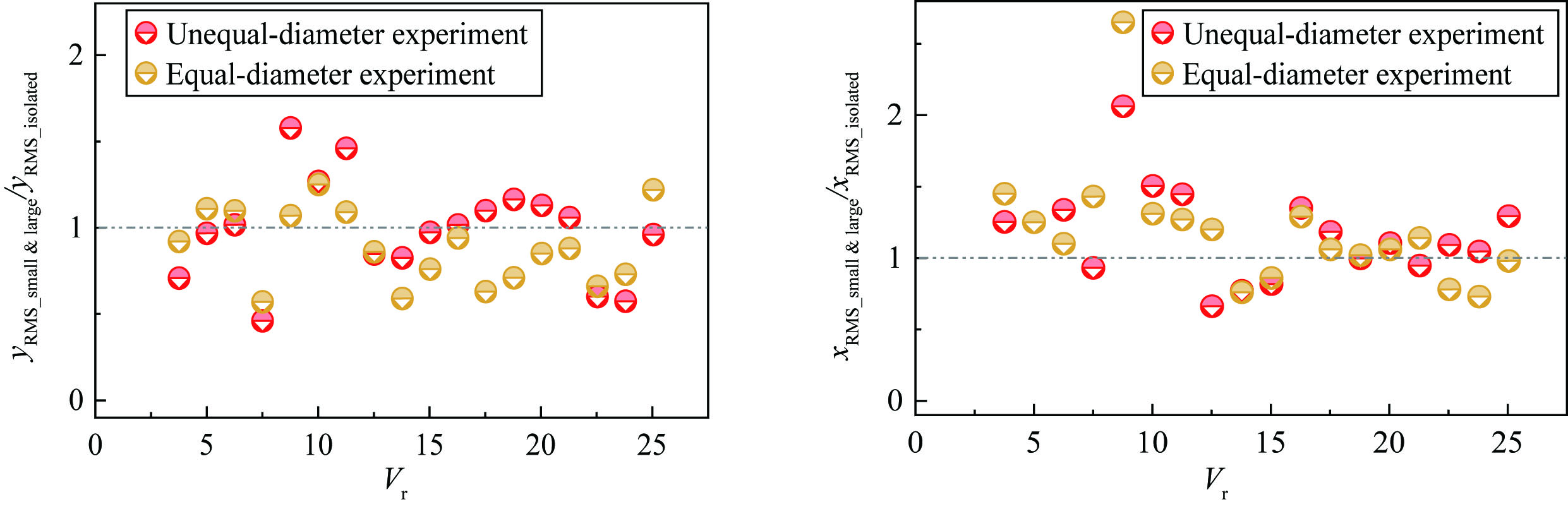 Till now, little information is available on the flow-induced vibration (FIV) of multiple flexible cylinders with unequal diameters. Some FIV characteristics of unequal-diameter cylinders can be predicted based on the knowledge of equal-diameter cylinders, while there are still other features remaining unrevealed. In this paper, the FIV characteristics of two flexible cylinders with unequal diameters arranged side-by-side are experimentally investigated. The diameter ratio of the small cylinder (Small Cyl.) to the large cylinder (Large Cyl.) is nearly 0.5. The aspect ratios and mass ratios of the two flexible cylinders are 350/181 and 1.90/1.47, respectively. The centre-to-centre spacing ratio in the cross-flow (CF) direction is kept constant as 6.0 and the two cylinders can oscillate freely in both the CF and in-line (IL) directions. The towing velocity varies from 0.05 m/s to 1.00 m/s. The dominant modes and frequencies, CF and IL displacement amplitudes and response trajectories are discussed. Compared with the case of two identical cylinders in our previous study, the FIV responses demonstrate some similarities and differences. The similarities are as follows. Both cylinders exhibit multi-mode vibration features and they interact with each other. Meanwhile, the IL FIV shows a more complex behaviour than that in the CF direction. The difference is that as the diameter of one cylinder is increased, the effect on the smaller cylinder becomes more significant. For Large Cyl., the FIV response is similar to its isolated counterpart, which indicates that Small Cyl. has a negligible effect on the FIV of the larger one. Whereas Large Cyl. perplexes the FIV of Small Cyl. during the vibration process. The spacing would change when both cylinders are oscillating. Proximity interference between the two cylinders and wake shielding effect of the Large Cyl. may occur. The dominant frequencies of Small Cyl. are reduced and the wake-induced flutter of Small Cyl. is observed from the response trajectories at different measuring points.