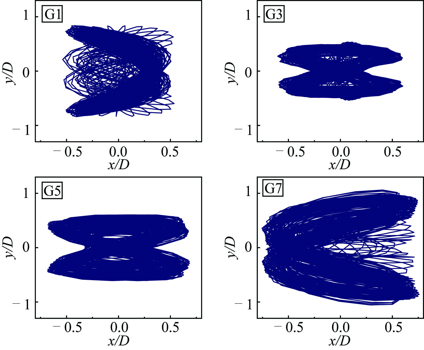 A vortex-induced vibration (VIV) experiment on three side-by-side risers subjected to a uniform flow was carried out in a combined wave-current flume. The dynamic features of interference effect on three side-by-side risers were investigated by varying fluid velocity and inter-riser spacing. The distributions of dimensionless displacement, dominant frequency, and displacement trajectory of the model risers were measured using mode decomposition and wavelet transform techniques. The coupled interference of inter-riser fluid to adjacent risers at different spacings was disclosed by introducing the “interference ratio” concept. The results show that at spacings smaller than 6.0D, the three model risers display appreciable deviations in their displacement responses in cross-flow or in-line direction, attributable to the strong proximity disturbance and wake interference between the risers. When the spacing is increased to 8.0D, wake interference still makes great difference to the dynamic response of the risers in both directions. As reduced velocity increases, the three risers show higher agreement with an isolated riser in overall dominant vibration frequency in CF direction than that in IL direction at all spacings and the side risers, although symmetrically placed, do not vibrate symmetrically, as a result of the steady deflection of clearance flow within the riser group. Interference effect results in a remarkable unsteady mode competition within the risers; quantitation of the interference levels for the three risers at different spacings with interference ratio revealed that under low flow velocities and large spacing ratios, clearance flow constitutes a non-neglectable interferer for three side-by-side risers.