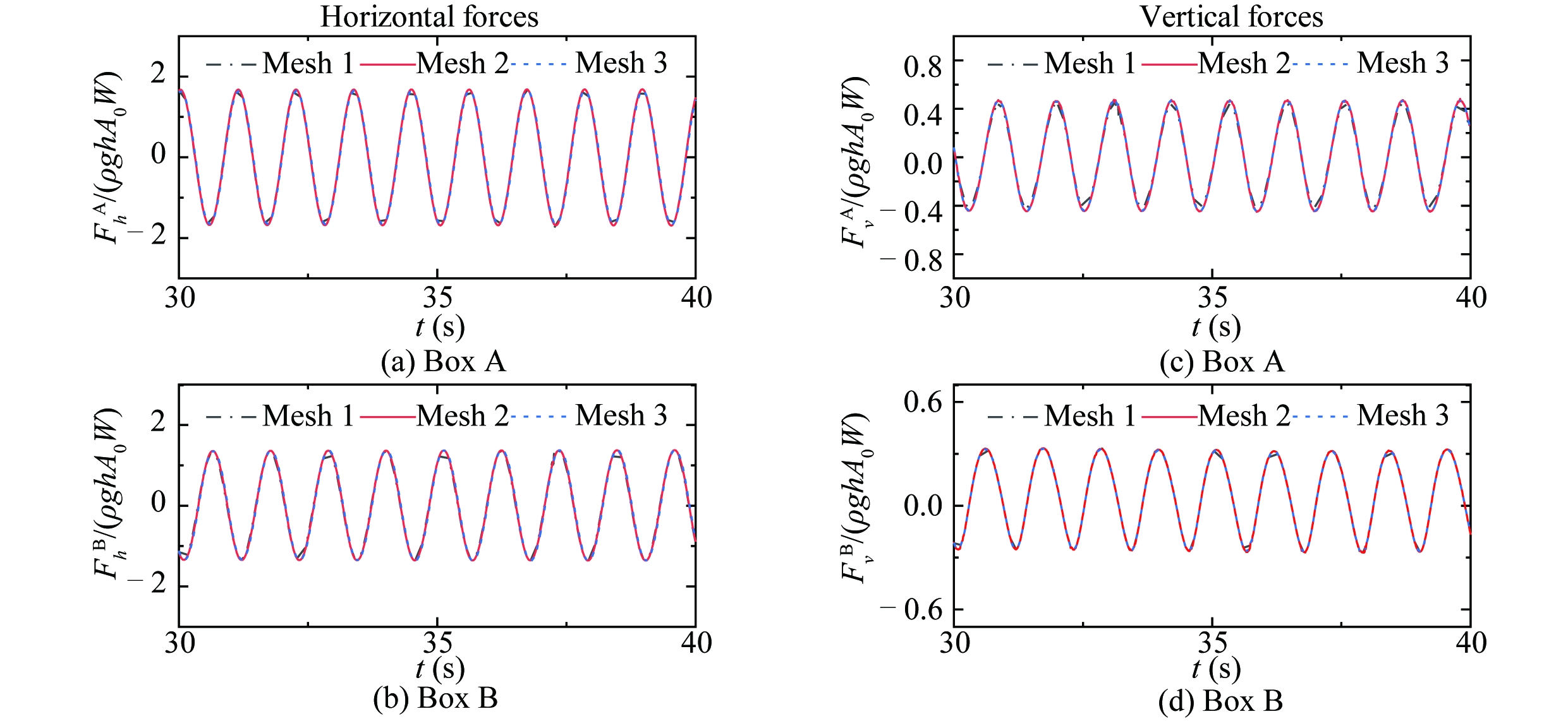 Wave forces on two side-by-side boxes in close proximity under wave actions were analyzed using the OpenFOAM package. The upstream box heaved freely under wave actions, whereas the downstream box remained fixed. For comparison, a configuration in which both boxes were fixed was also considered. The effects of the heave motion of the upstream box on the wave loads, including the horizontal wave forces, vertical wave forces, and moments on the boxes, were the focus of this study. Numerical analyses showed that all frequencies at which the maximum horizontal wave forces, maximum vertical wave forces, and maximum moment appeared are dependent on the heave motion of the upstream box and that the effects of the heave motion on these frequencies are different. Furthermore, these frequencies were observed to deviate from the corresponding fluid resonant frequency. Moreover, the heave motion of the upstream box reduced the wave forces acting on both boxes and altered the variation trends of the wave forces with the incident wave frequency.