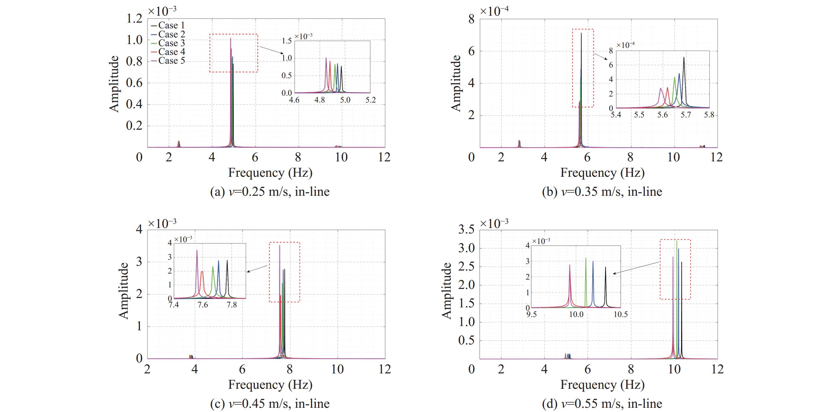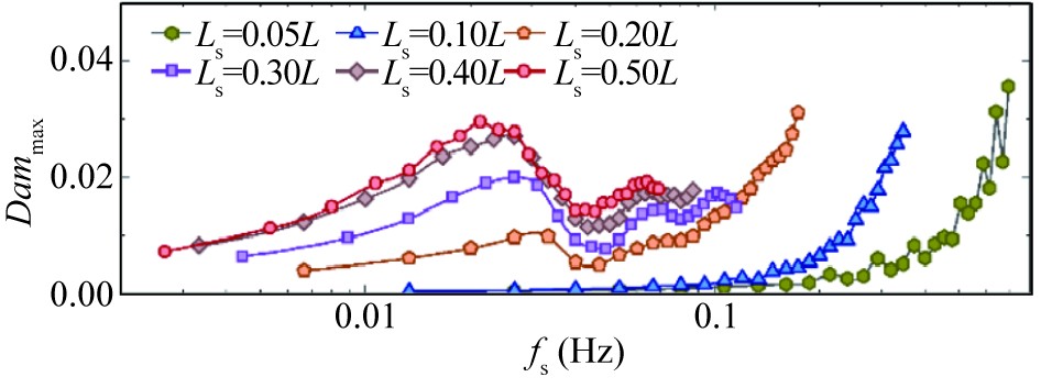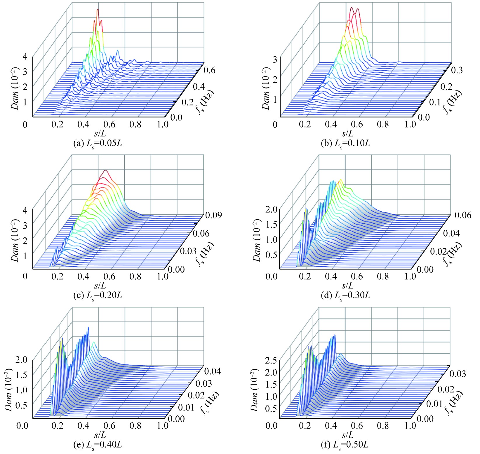 A deep-sea mining riser is a crucial component of the system used to lift seafloor mineral resources to the vessel. It is prone to damage and failure because of harsh environmental conditions and internal fluid erosion. Furthermore, damage can impact the response characteristics of the riser, but varying environmental loadings easily mask it. Thus, distinguishing between riser damage and environmental effects poses a considerable challenge. To address this issue, a cantilevered model is created for a deep-sea mining riser via the concentrated mass method, and a time-domain analytical strategy is developed. The vortex-induced vibration (VIV) response characteristics of the riser are initially examined, considering various damage conditions and flow velocities. The study results revealed four primary observations: (a) effective tension can serve as a reliable indicator for identifying damage at lower velocities; (b) there are noticeable differences in displacement between the healthy and damaged risers in the in-line direction rather than the cross-flow direction; (c) frequency characteristics can more effectively distinguish the damage conditions at high flow velocities, with the mean square frequency and frequency variance being more effective than the centroid frequency and root variance frequency; (d) displacement differences are more sensitive to damage occurring near the top and bottom of the riser, while both velocity variations and structural damage can influence displacements, especially in regions between modal nodes. The vibrational behavior and damage indicators are clarified for structural health monitoring of deep-sea mining risers during lifting operations.