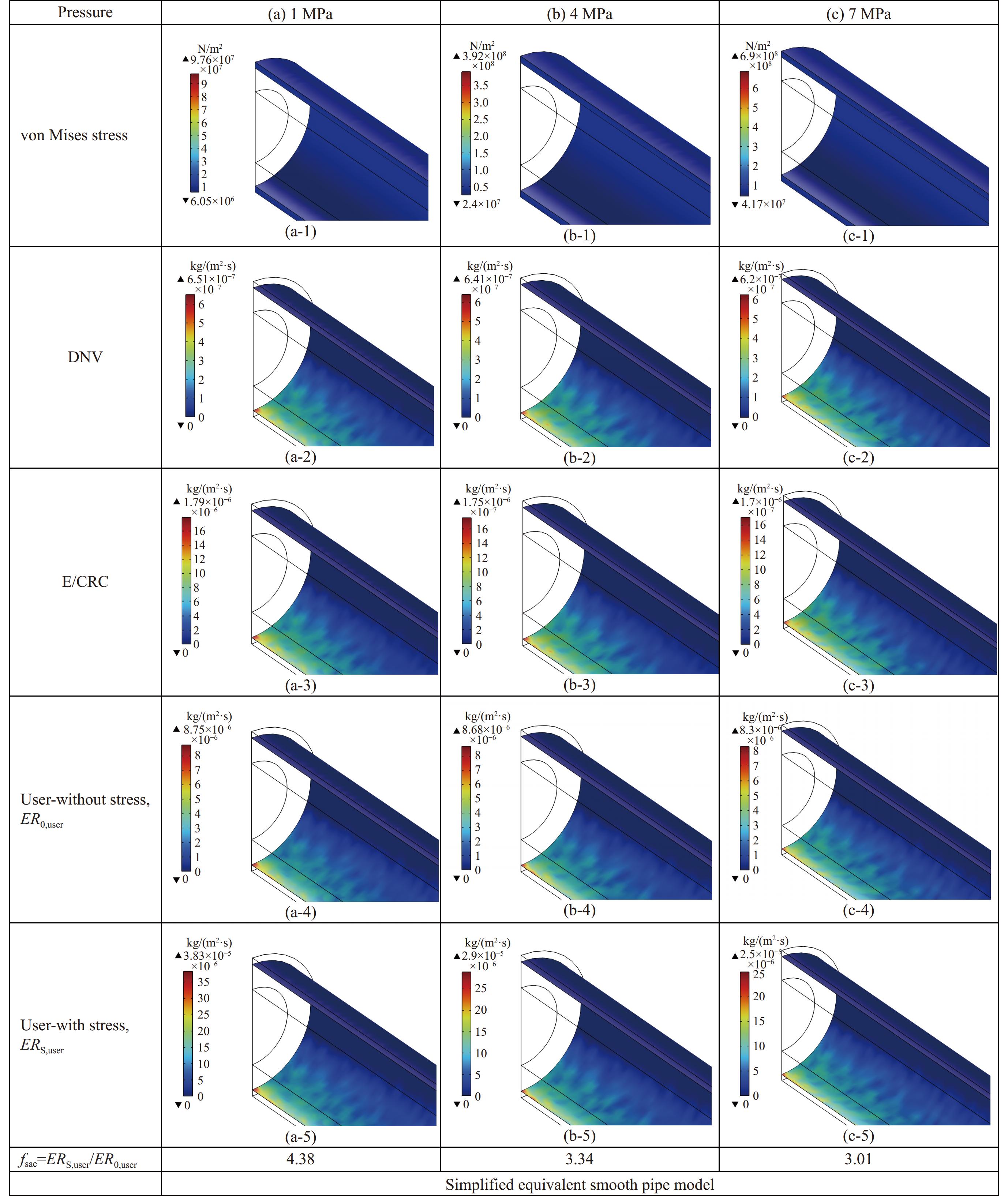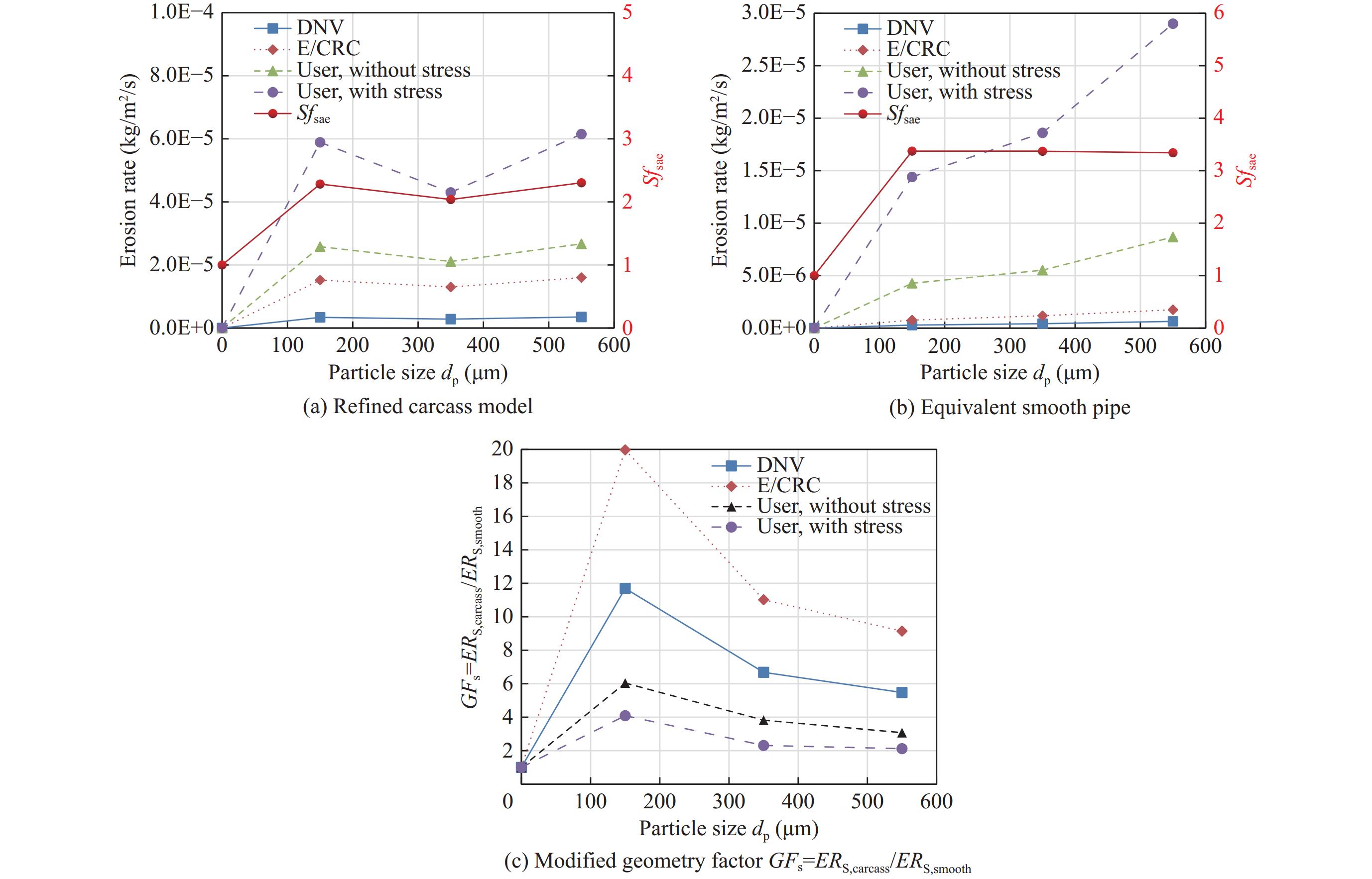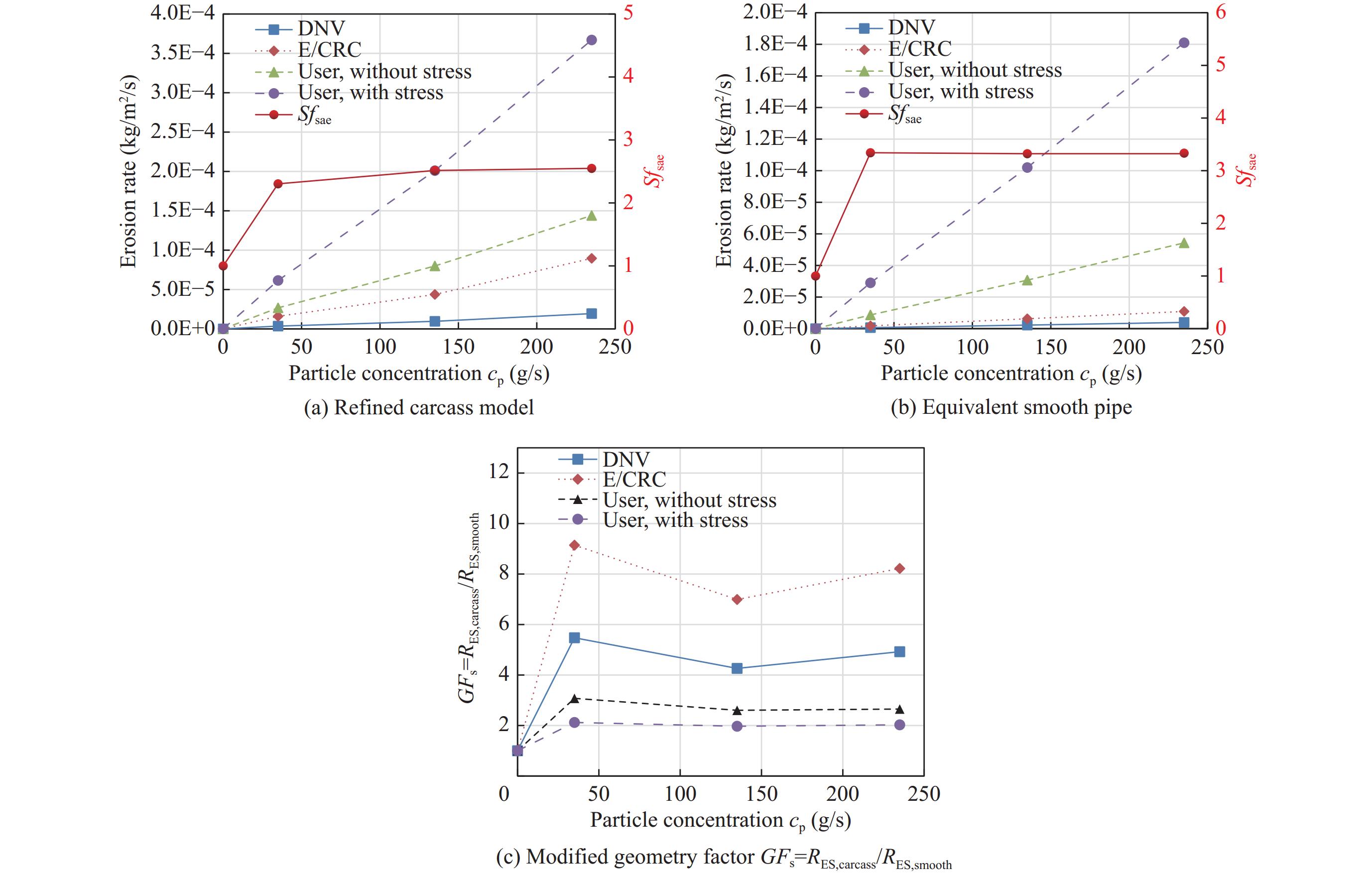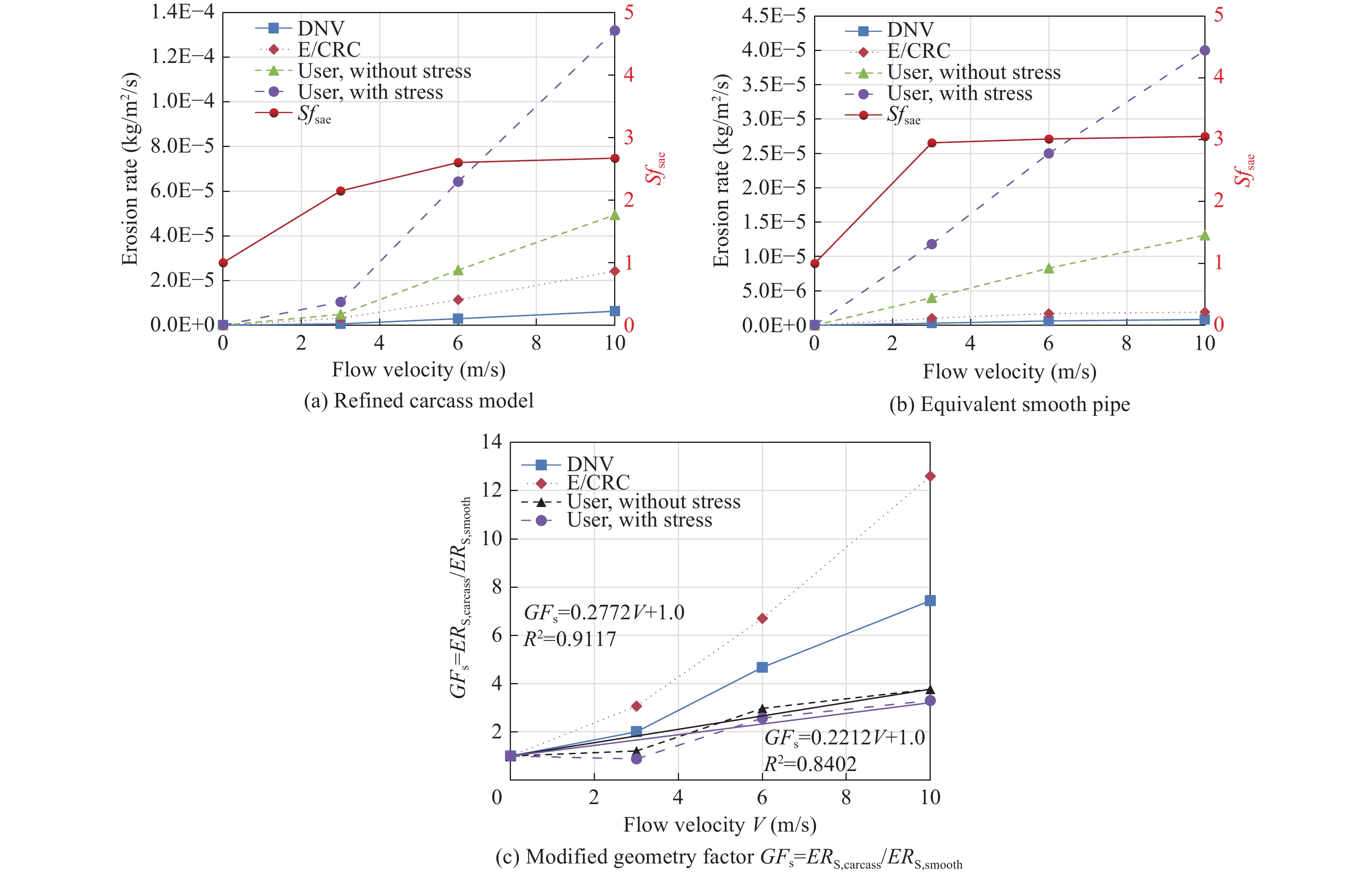 A carcass is the innermost layer of a deep-sea unbonded flexible pipe, which is in direct contact with the gas/liquid-solid multi-phase flow. Considering that stress-accelerated erosion is common for carcasses, this study proposes a general model and simulation method for stress-accelerated erosion (SE) of carcasses under external water pressure. First, an SE model suitable for 316 stainless steel was developed, which was then used for stress-erosion simulation for an external pressurized carcass, and the solid domain, fluid domain and rough inner surface of the carcass were carefully considered. Moreover, a simplified model (equivalent smooth pipe) was also established on the basis of the main geometric characteristics of the carcass, and the stress-erosion characteristics under different operating conditions, including the effects of the elastic stress level, flow velocity, particle diameter and concentration, were carefully compared, and the key factors governing the elastic stress-erosion of the carcass were discussed. Finally, a modified geometry factor (GF) for carcasses was proposed considering the stress acceleration effect.
