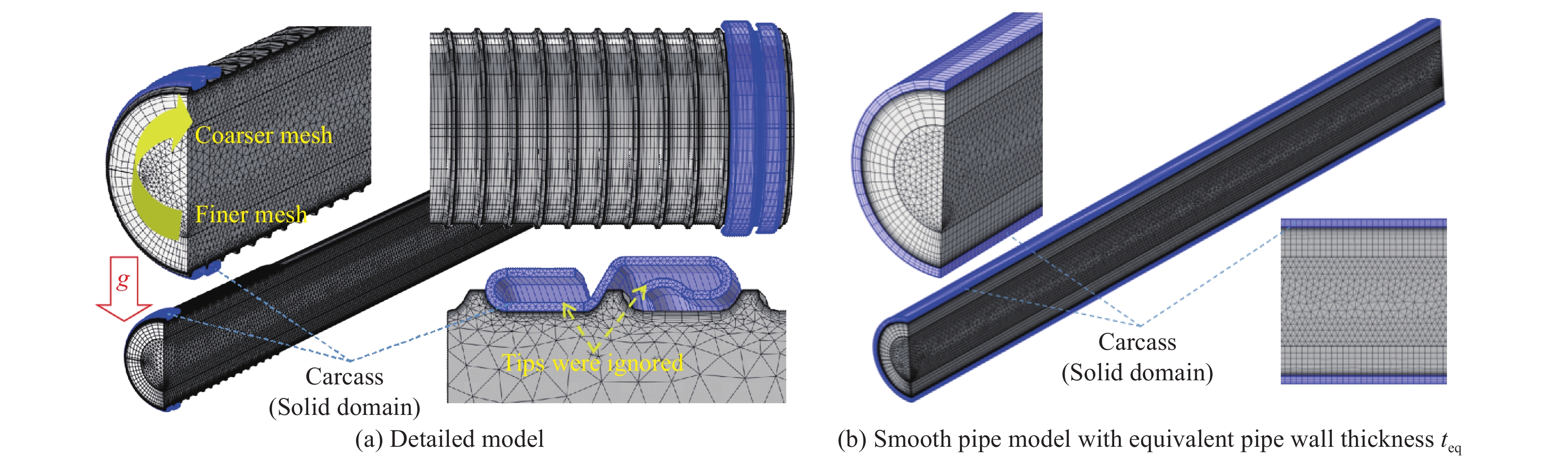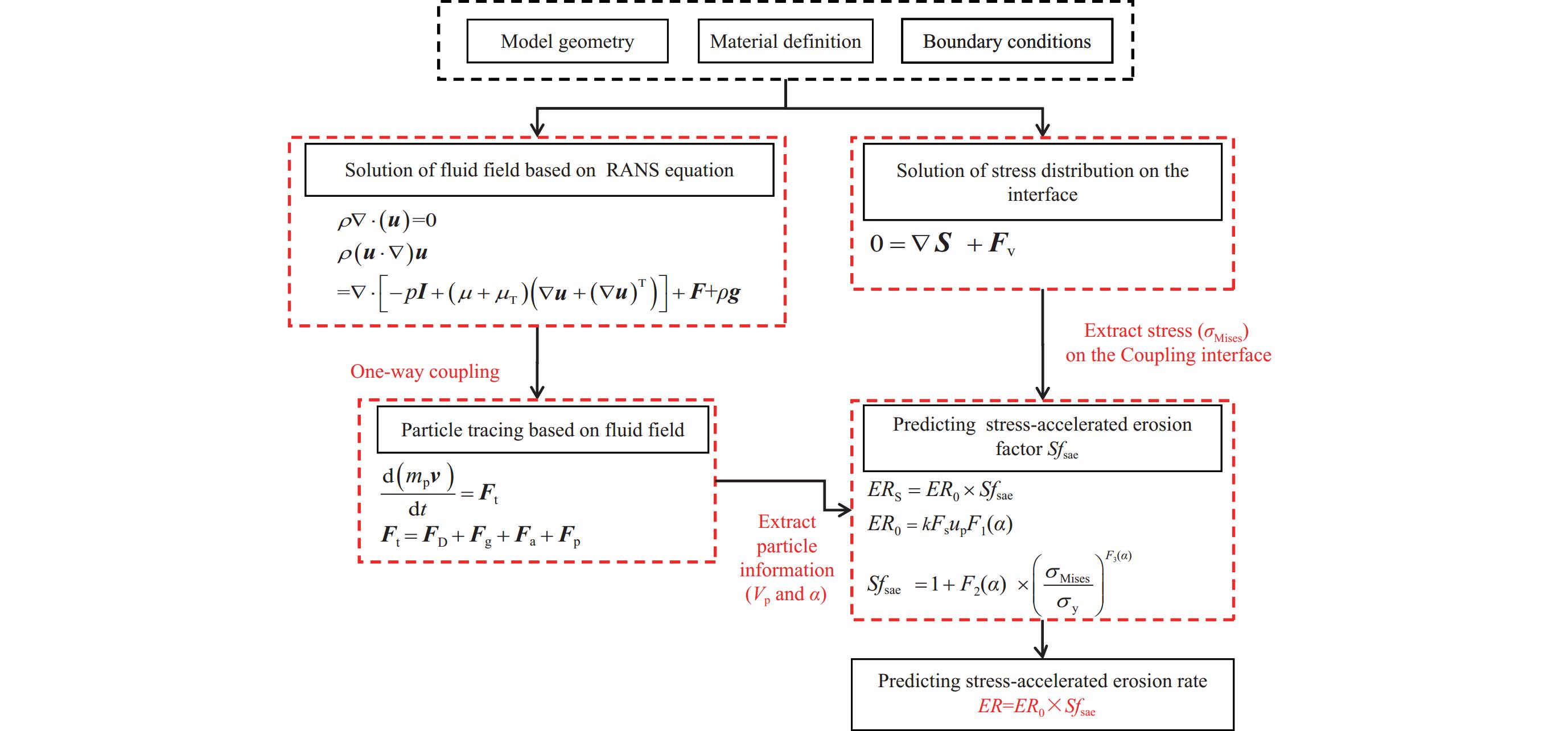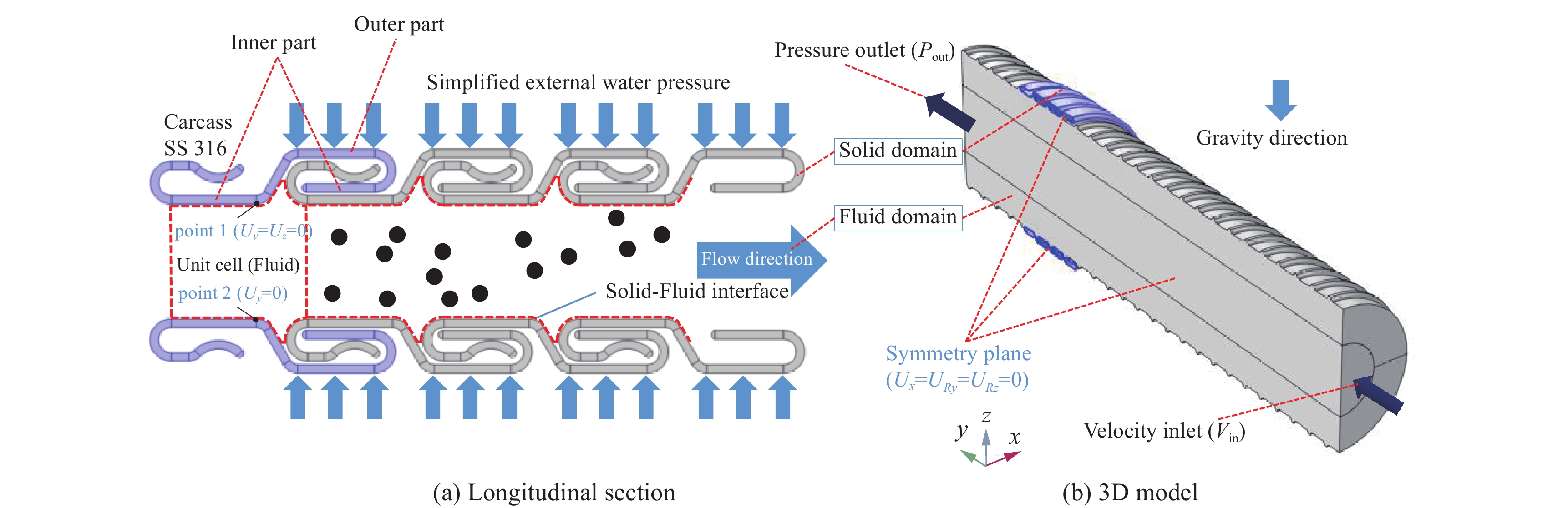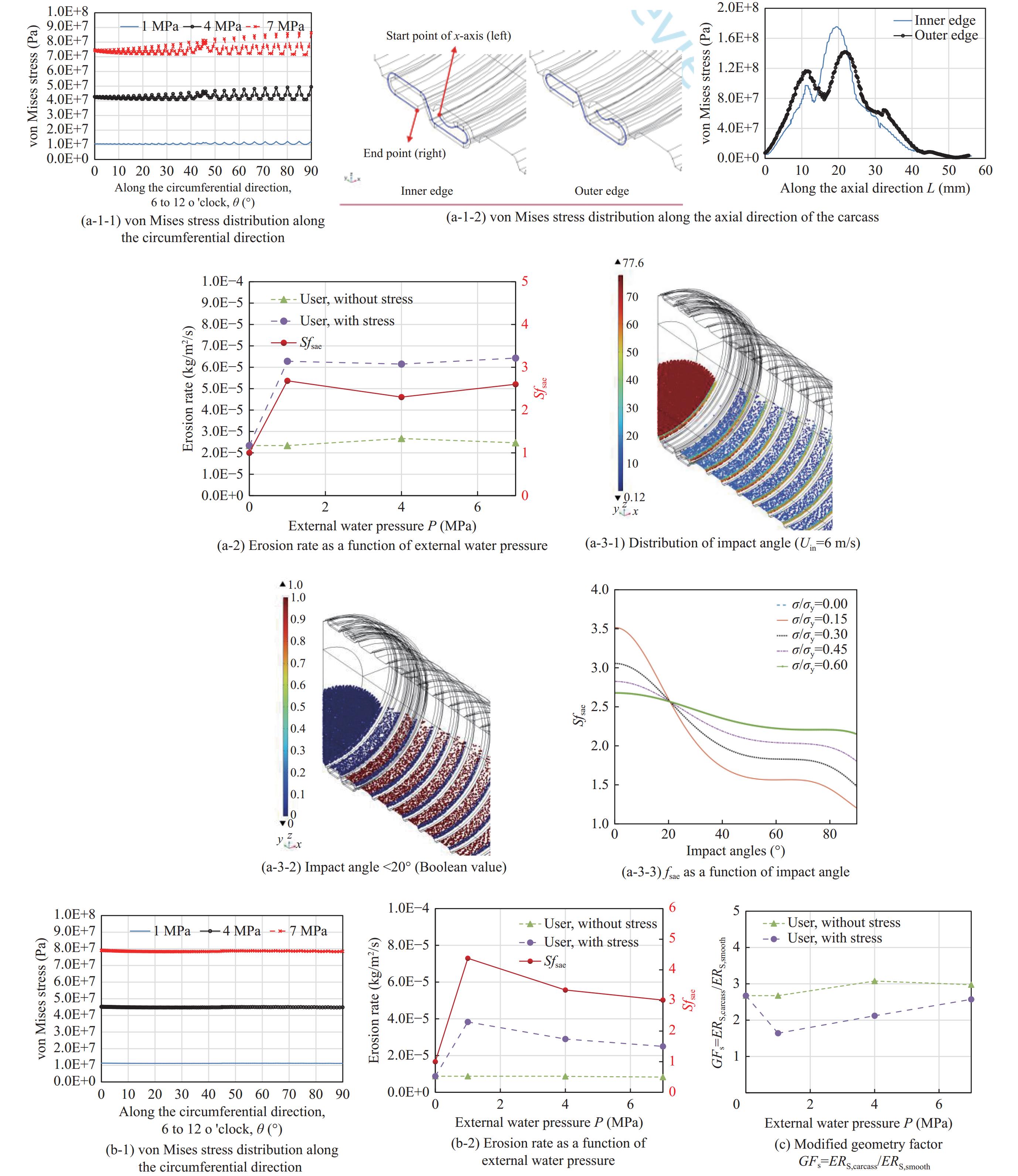 A carcass is the innermost layer of a deep-sea unbonded flexible pipe, which is in direct contact with the gas/liquid-solid multi-phase flow. Considering that stress-accelerated erosion is common for carcasses, this study proposes a general model and simulation method for stress-accelerated erosion (SE) of carcasses under external water pressure. First, an SE model suitable for 316 stainless steel was developed, which was then used for stress-erosion simulation for an external pressurized carcass, and the solid domain, fluid domain and rough inner surface of the carcass were carefully considered. Moreover, a simplified model (equivalent smooth pipe) was also established on the basis of the main geometric characteristics of the carcass, and the stress-erosion characteristics under different operating conditions, including the effects of the elastic stress level, flow velocity, particle diameter and concentration, were carefully compared, and the key factors governing the elastic stress-erosion of the carcass were discussed. Finally, a modified geometry factor (GF) for carcasses was proposed considering the stress acceleration effect.