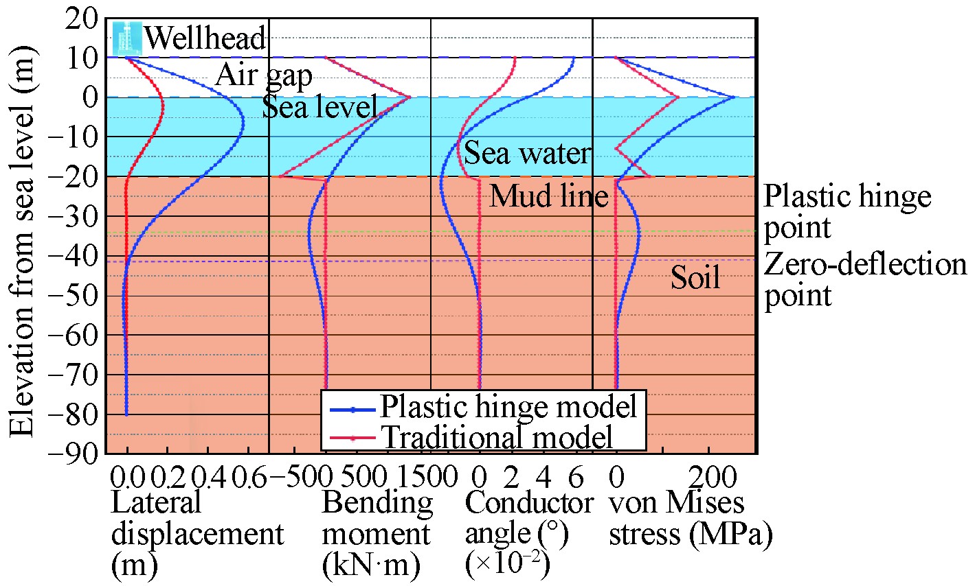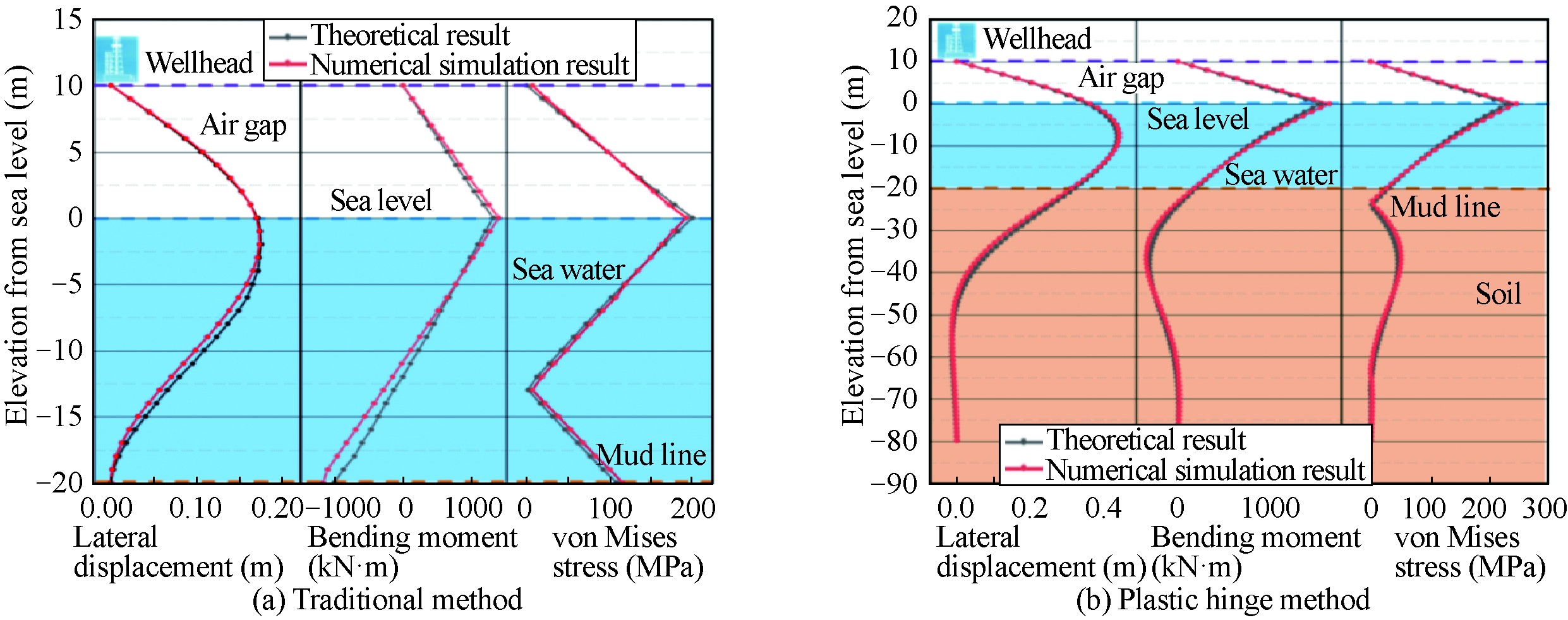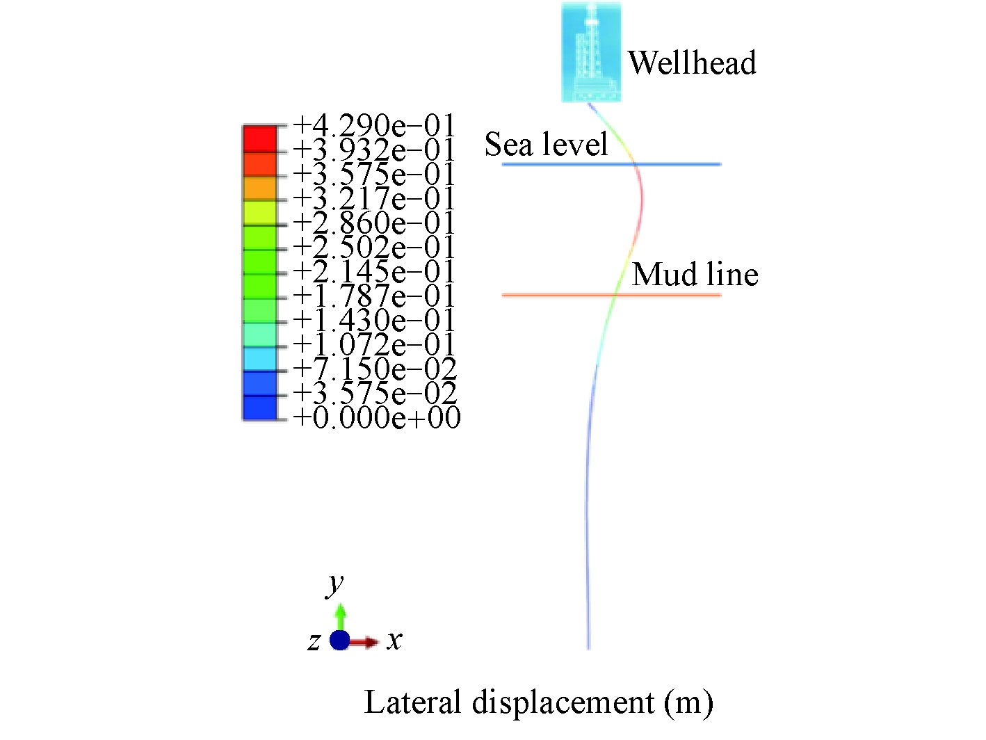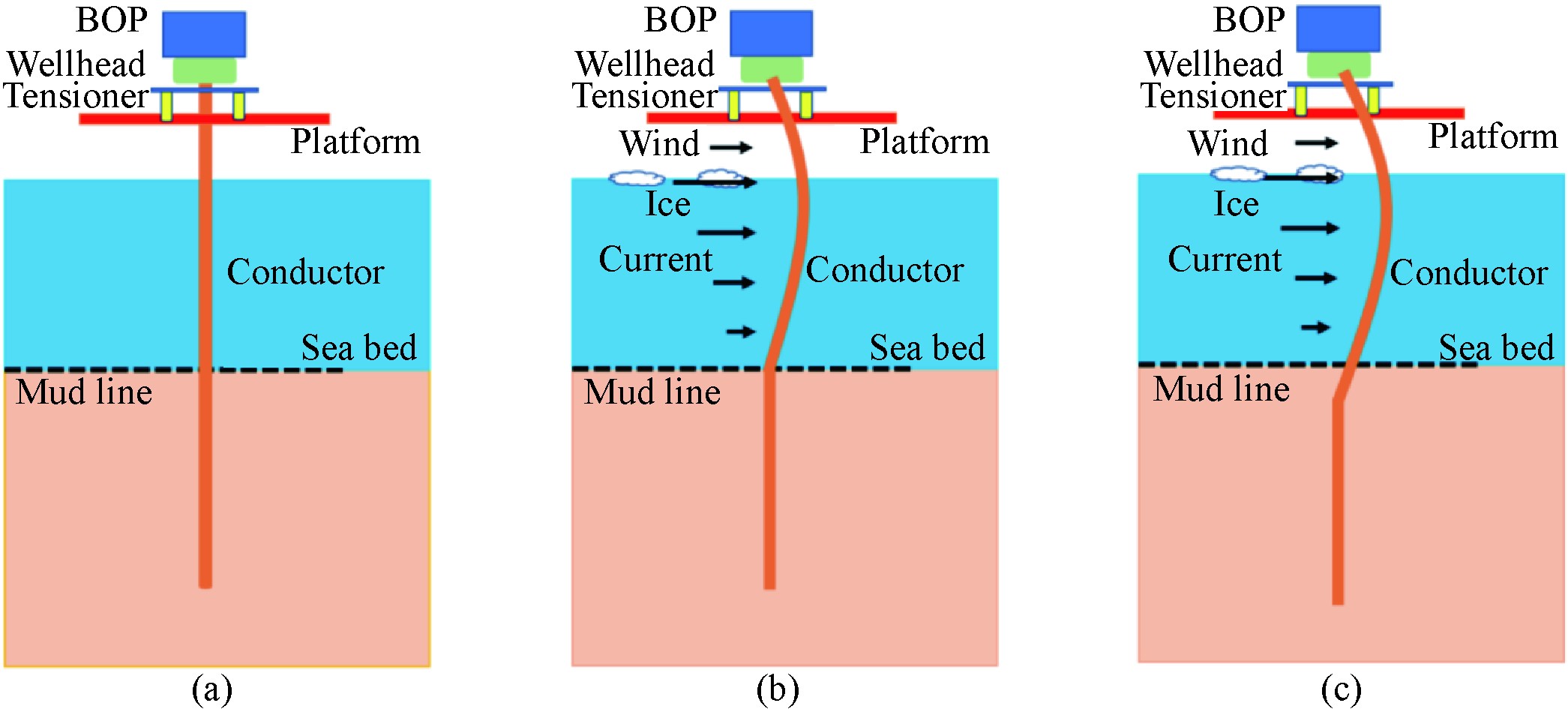 With increasing water depth, marine drilling conductors exhibit higher slenderness ratios, significantly reducing their resistance to environmental loads in Arctic waters. These conductors, when subjected to combined wind, current, and ice loads, may experience substantial horizontal displacements and bending moments, potentially compromising offshore operational safety and wellhead stability. Additionally, soil disturbance near the mudline diminishes the conductor’s bearing capacity, potentially rendering it inadequate for wellhead support and increasing operational risks. This study introduces a static analysis model based on plastic hinge theory to evaluate conductor survivability. The conductor analysis divides the structure into three segments: above waterline, submerged, and embedded below mudline. An idealized elastic-plastic p-y curve model characterizes soil behavior beneath the mudline, while the finite difference method (FDM) analyzes the conductor’s mechanical response under complex pile-head boundary conditions. Numerical simulations using ABAQUS validate the plastic hinge approach against conventional methods, confirming its accuracy in predicting structural performance. These results provide valuable insights for optimizing installation depths and bearing capacity designs of marine drilling conductors in ice-prone regions.