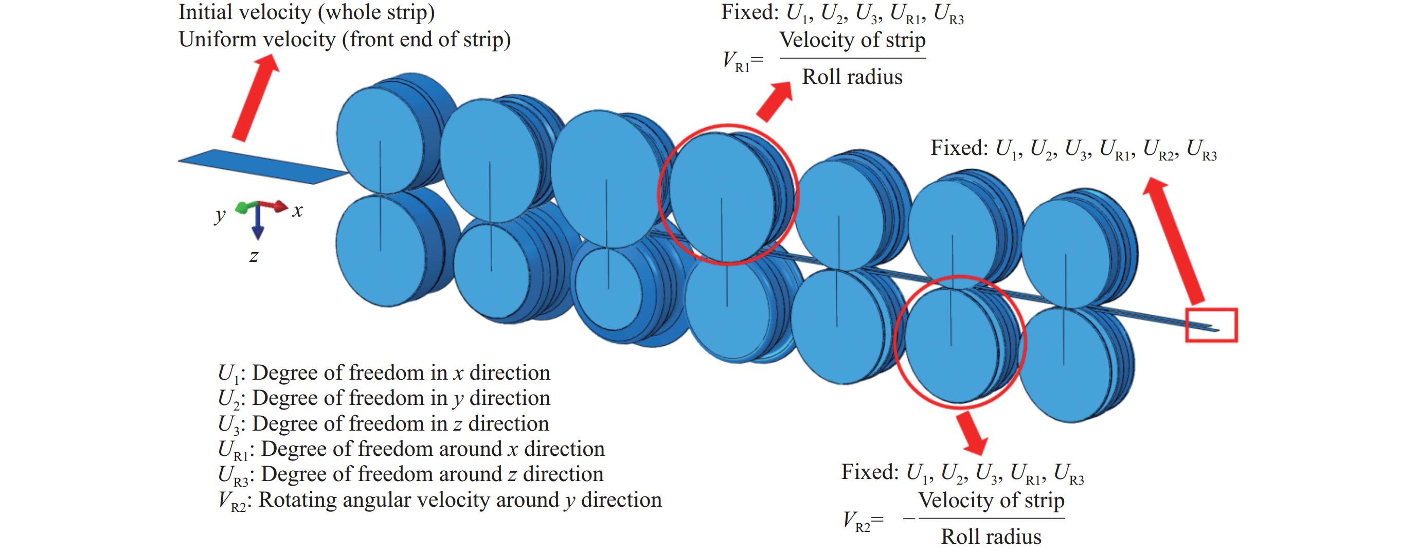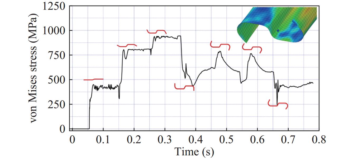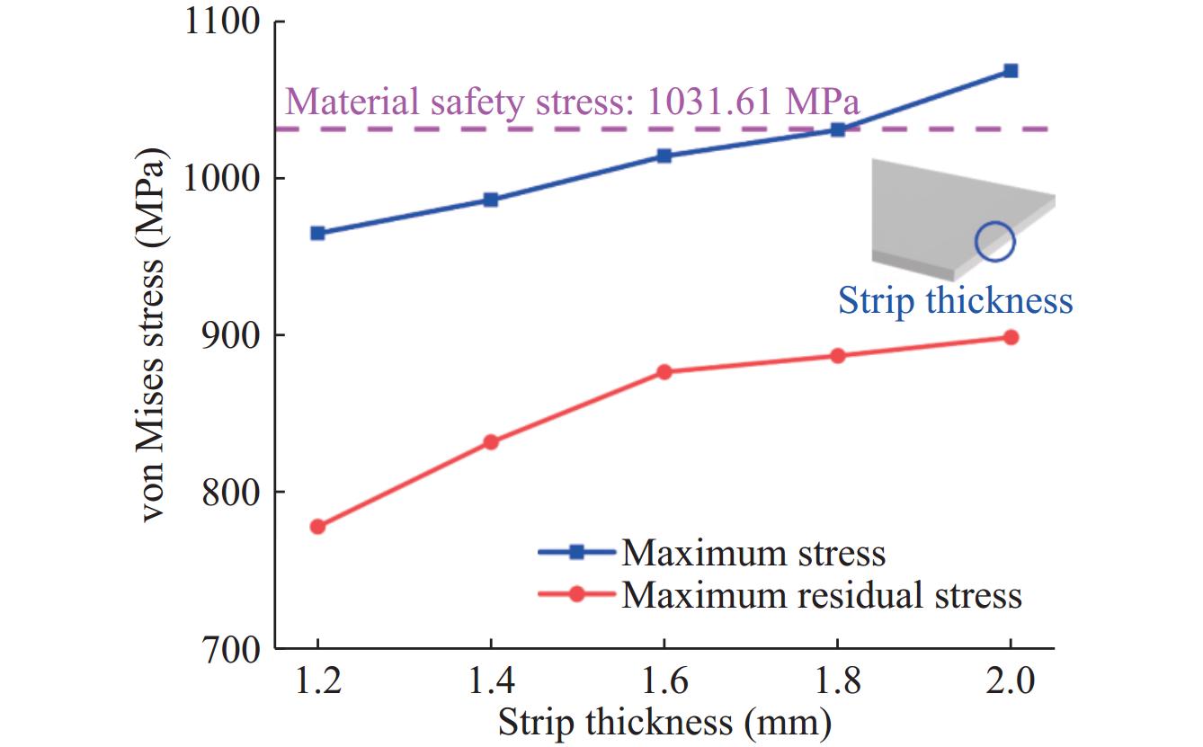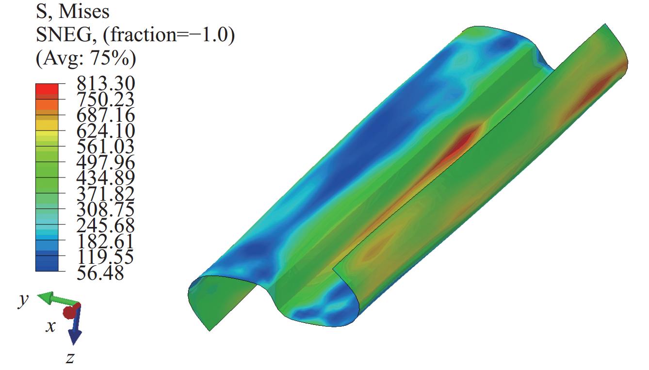 The carcass layer is the innermost structure of flexible marine risers and is responsible for resisting external pressure. It has an “S” section with a spiral interlocking feature. After the multi-pass roll forming of a flat steel strip, a carcass layer is formed by lock forming. During roll forming, the steel strip undergoes significant plastic deformation, and its local area accumulates residual stress owing to multiple loading and unloading cycles. These phenomena complicate the design and analysis of the carcass layer multi-pass roll forming (CLMRF) process and cause issues in the carcass layer during manufacturing, such as strip fracture and low forming quality. Thus, herein, CLMRF was investigated to clarify the stress distribution, and a parameter analysis was performed. First, the CLMRF process was designed on the basis of classical roll-forming design theory. Second, a finite element model was established, and CLMRF was simulated. Third, the distributions of the forming stress and residual stress of the strip during CLMRF were investigated. Finally, the influences of the strip thickness, roll gap, roll distance, and angular increment were investigated. The conclusions of this study can be used to provide technical guidance in the manufacturing of flexible risers.