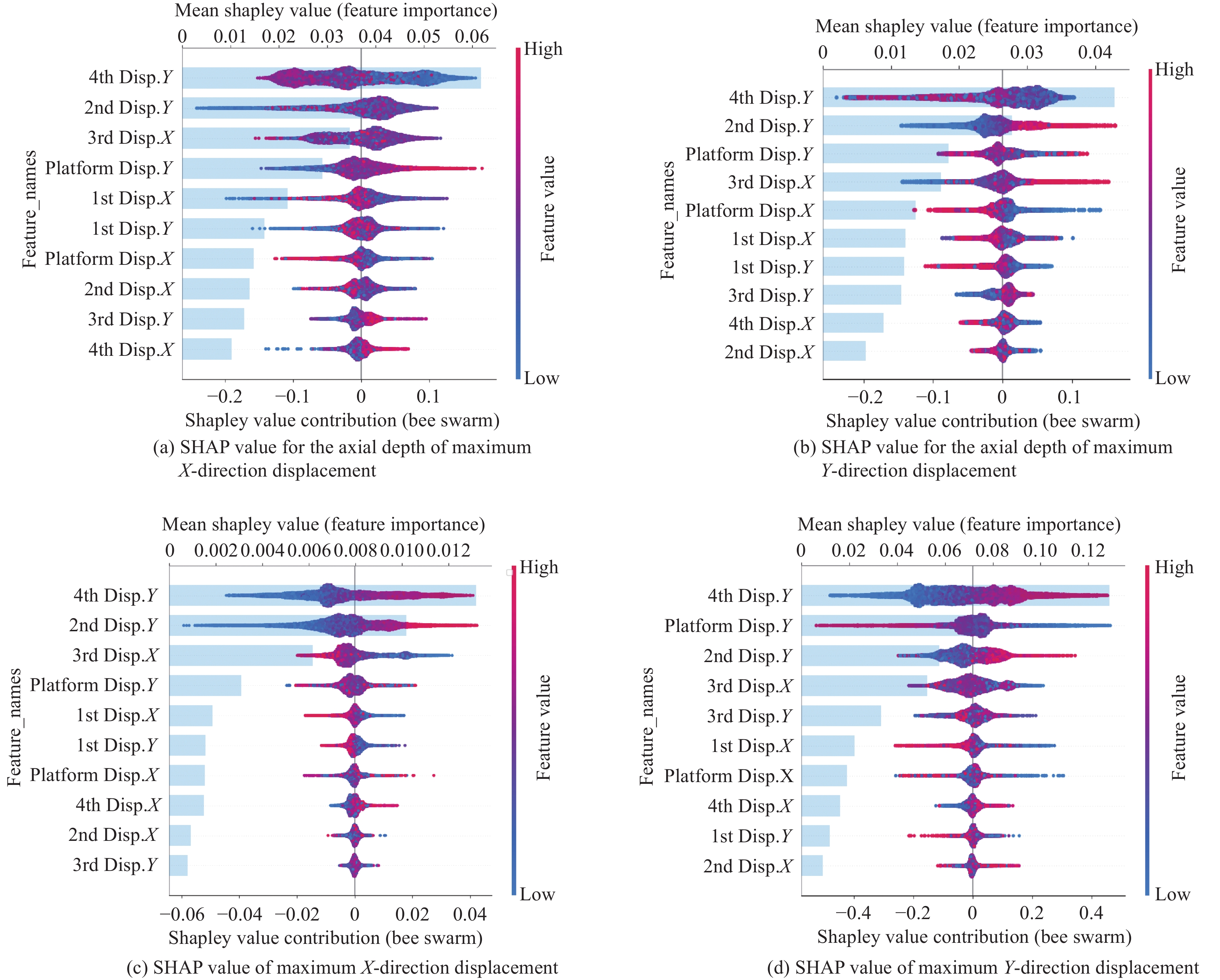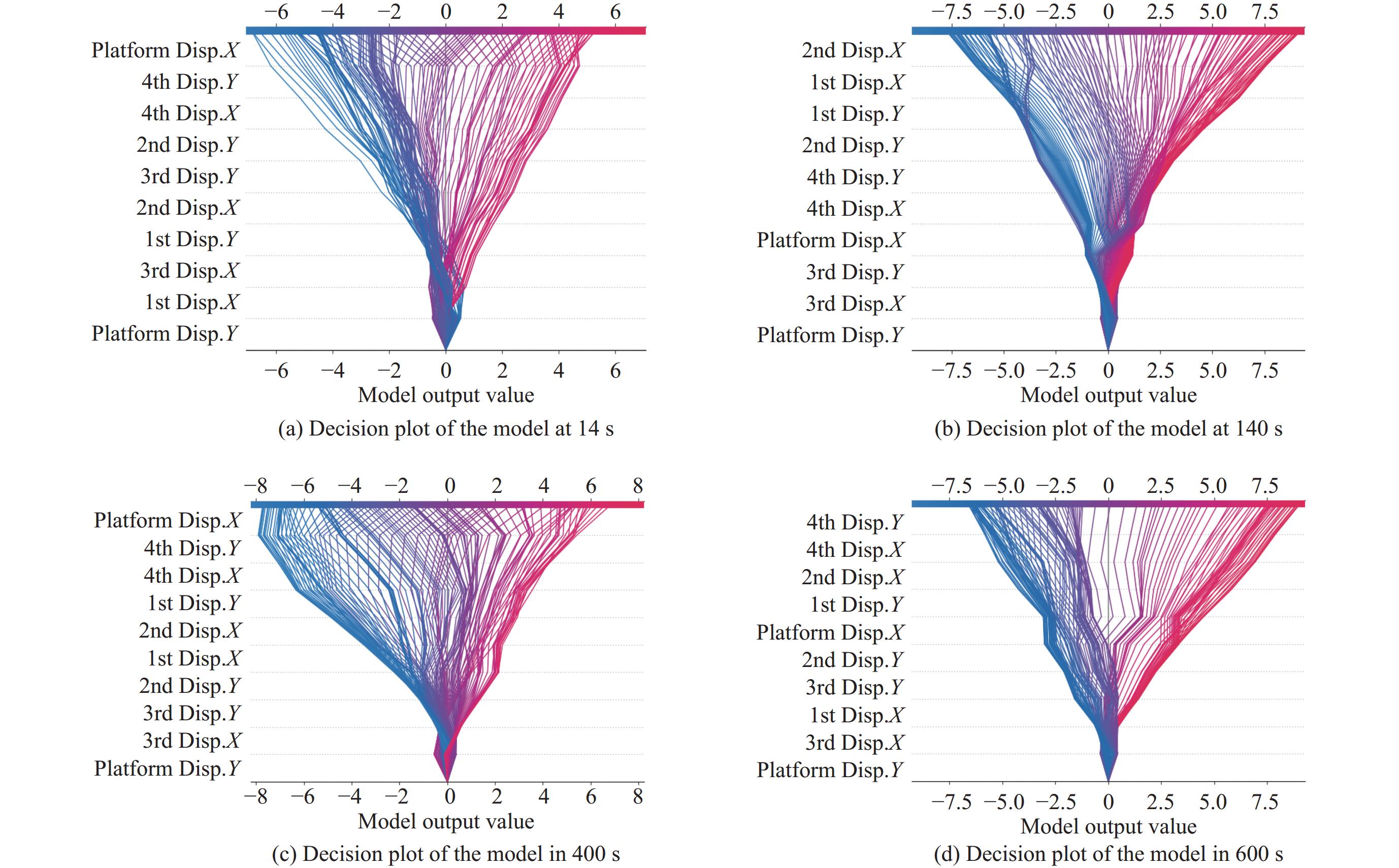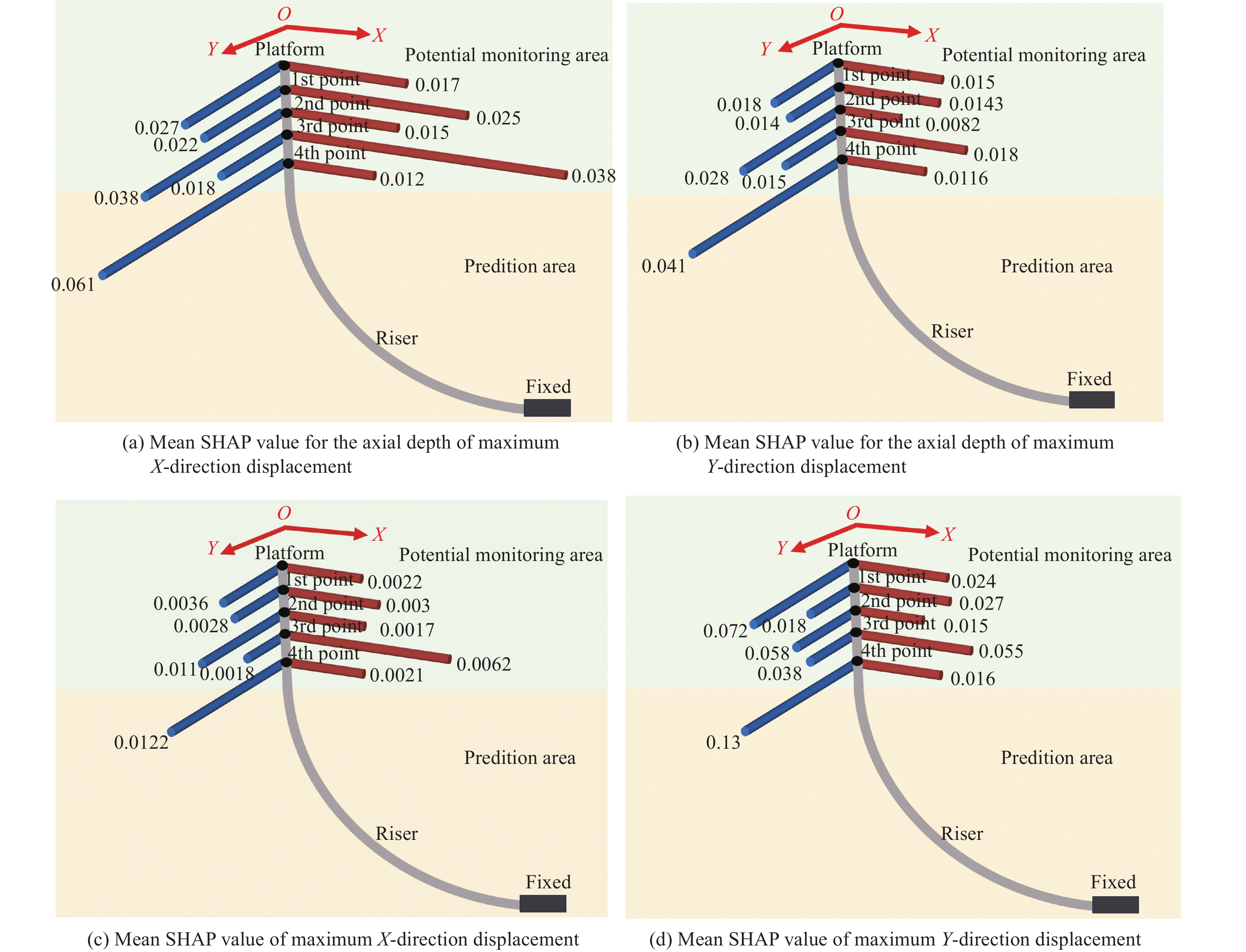 Mitigating vortex-induced vibrations (VIV) in flexible risers represents a critical concern in offshore oil and gas production, considering its potential impact on operational safety and efficiency. The accurate prediction of displacement and position of VIV in flexible risers remains challenging under actual marine conditions. This study presents a data-driven model for riser displacement prediction that corresponds to field conditions. Experimental data analysis reveals that the XGBoost algorithm predicts the maximum displacement and position with superior accuracy compared with Support vector regression (SVR), considering both computational efficiency and precision. Platform displacement in the Y-direction demonstrates a significant positive correlation with both axial depth and maximum displacement magnitude. The fourth point displacement exhibits the highest contribution to model prediction outcomes, showing a positive influence on maximum displacement while negatively affecting the axial depth of maximum displacement. Platform displacement in the X- and Y-directions exhibits competitive effects on both the riser’s maximum displacement and its axial depth. Through the implementation of XGBoost algorithm and SHapley Additive exPlanation (SHAP) analysis, the model effectively estimates the riser’s maximum displacement and its precise location. This data-driven approach achieves predictions using minimal, readily available data points, enhancing its practical field applications and demonstrating clear relevance to academic and professional communities.