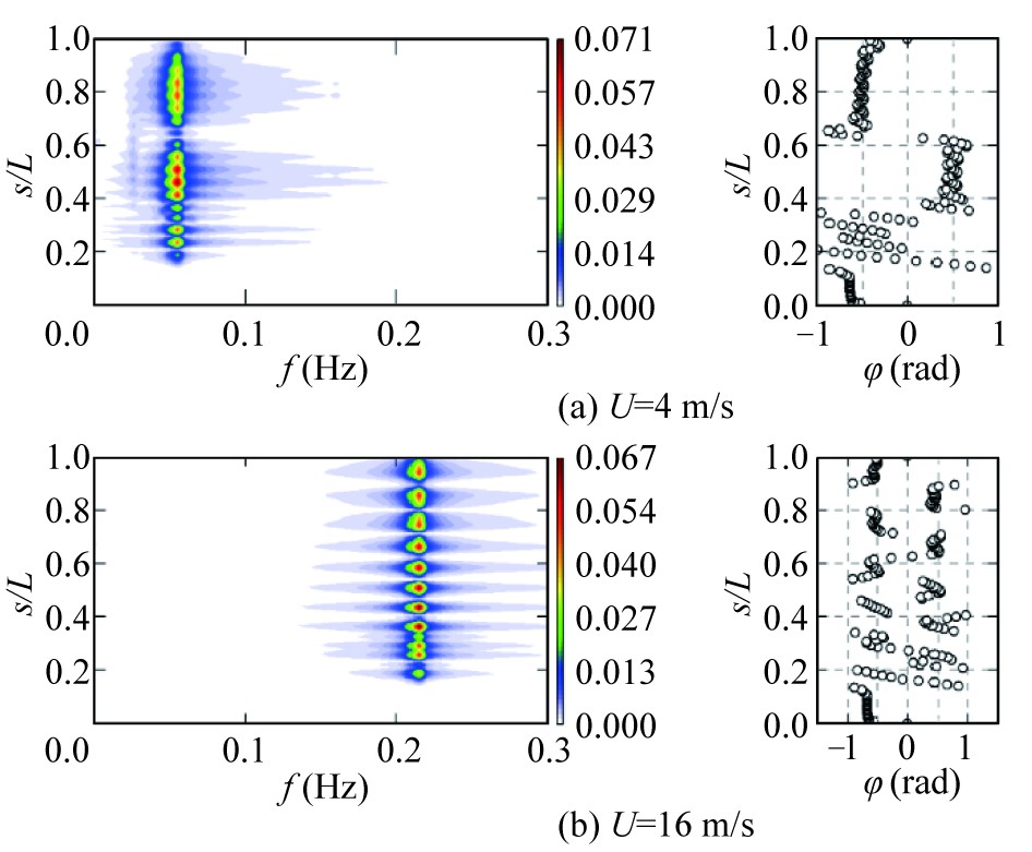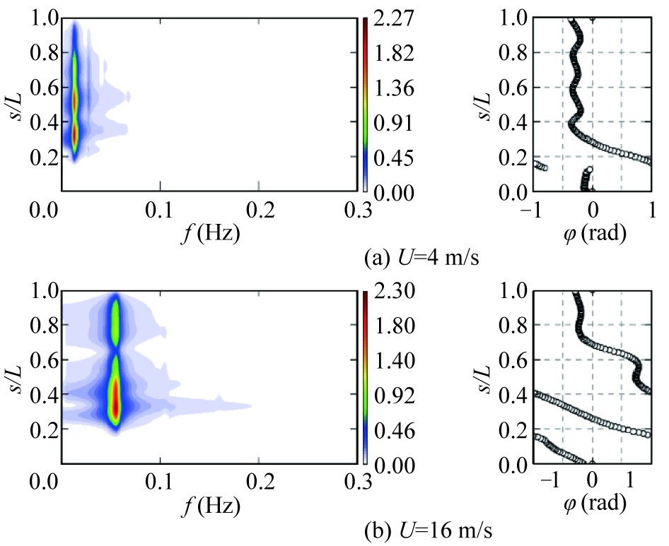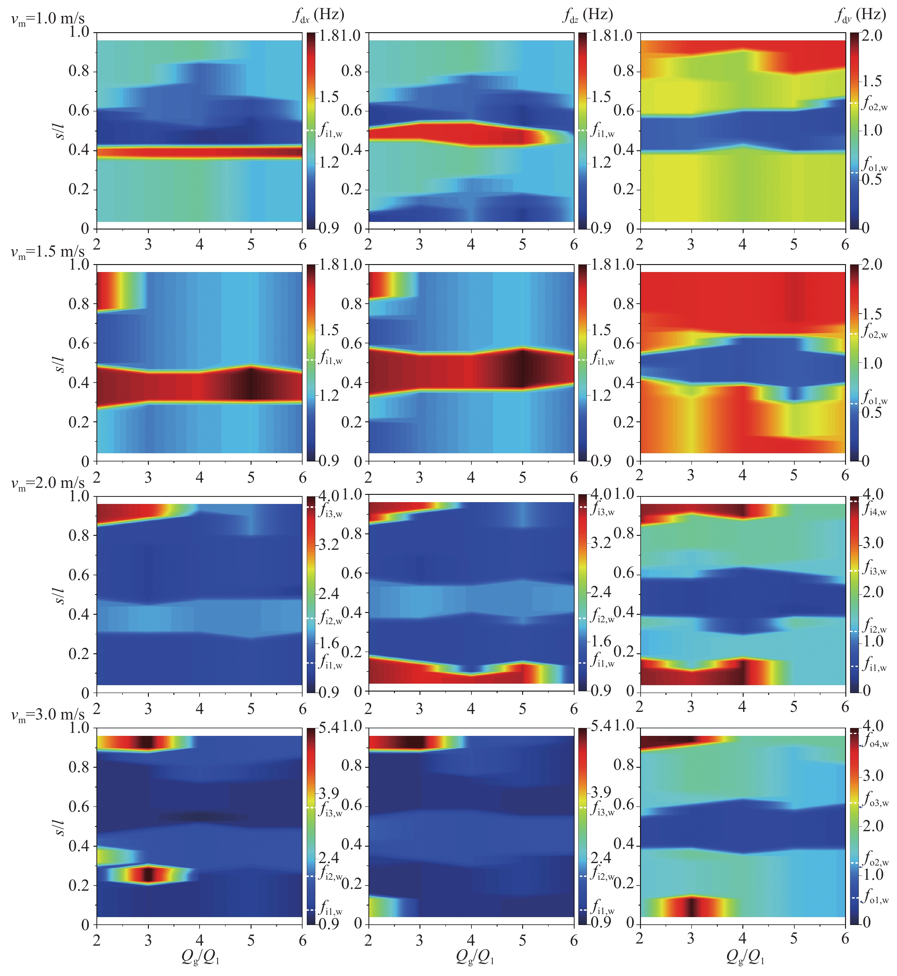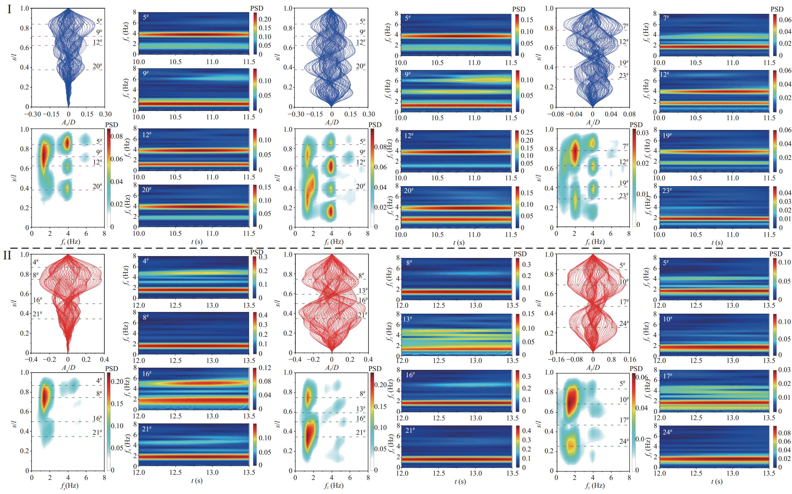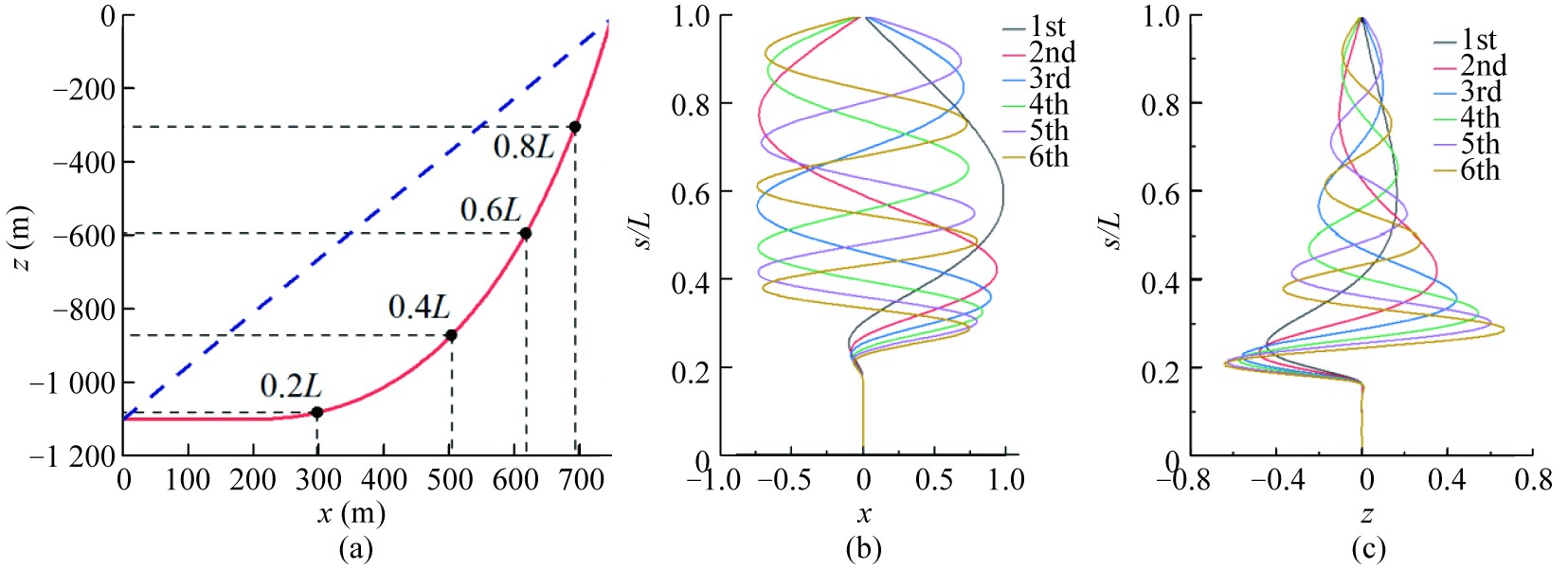 An experimental analysis of the slug-induced vibration (SIV) of a flexible catenary riser with an aspect ratio of 130 is reported in this work. The vibration responses and internal slug flow details at different gas-liquid ratios (Qg/Ql) and mixture velocities (vm) are non-intrusively and simultaneously captured by high-speed cameras. Both the in-plane and out-of-plane responses of the catenary riser are excited in all considered cases. The slug flow characteristics, including translational velocities, slug lengths, recurrence frequencies, and pressure variations, are analyzed and discussed, as are the dynamic responses of the riser in terms of the amplitudes, space-varying frequency, and modal weight. The dominant modal response based on the root-mean-square amplitude profiles does not match that based on the dominant frequency. Three mode switching types are identified based on the RMS amplitude profiles and the dominant frequency. When vm is small, no mode switching (NMS) is observed in either the in-plane or out-of-plane responses. For mode switching I (MS I), the switching between the first and second modes in the in-plane response is induced by slug flow with different recurrence frequencies in cases of large Qg/Ql. However, there is no mode switching in the out-of-plane response. The switching between the first and third modes for the in-plane response and the second and fourth modes for the out-of-plane response (MS II) occurs in cases of relatively high vm and low Qg/Ql.