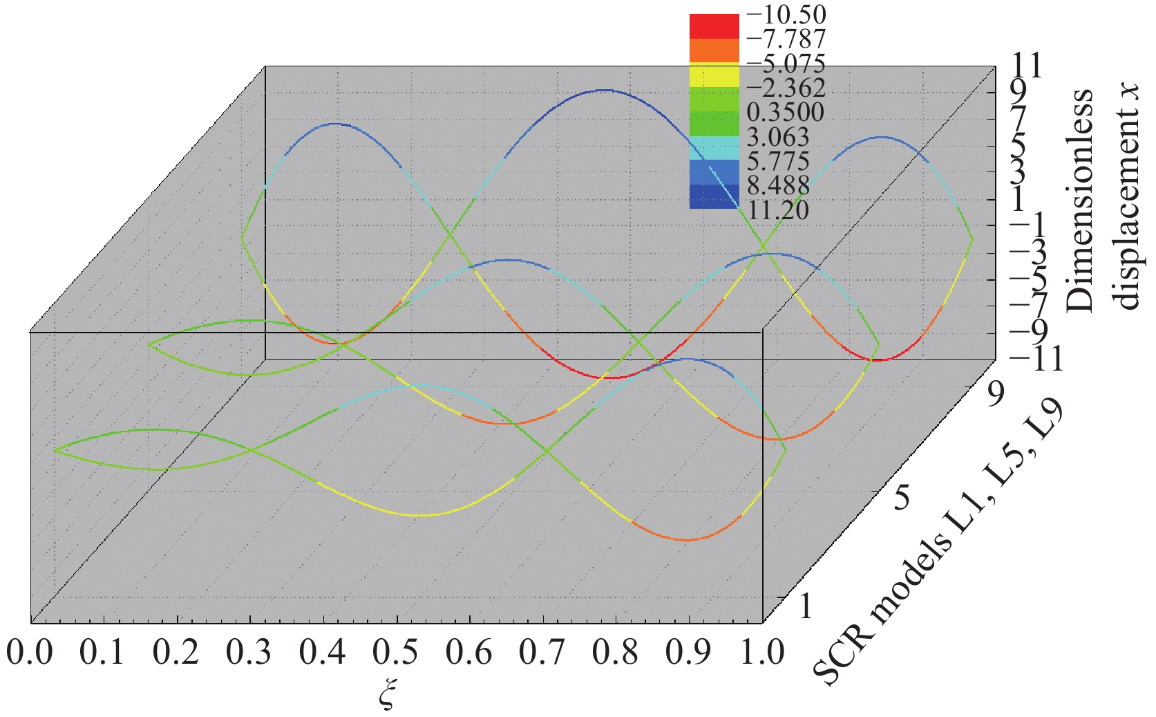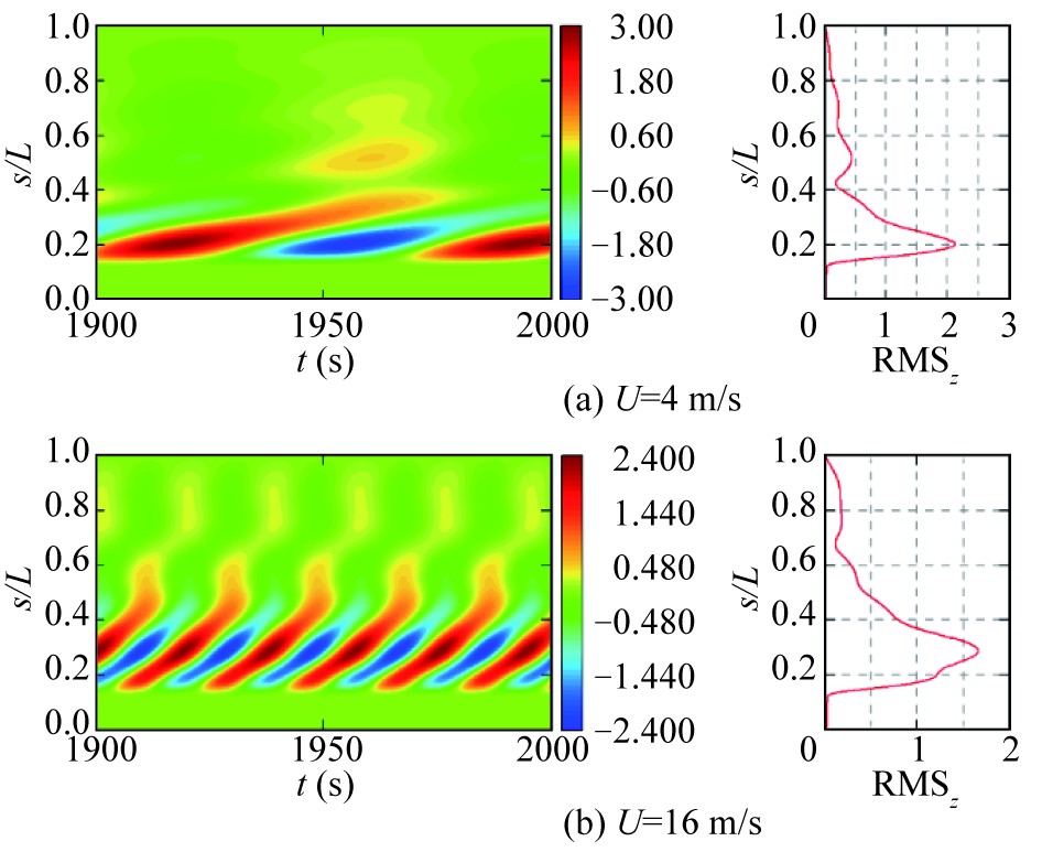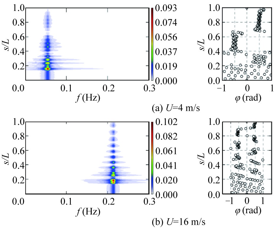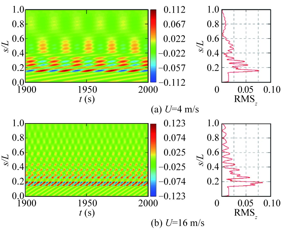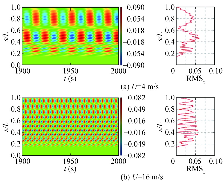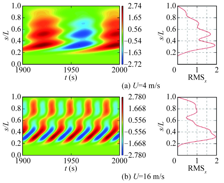 An experimental analysis of the slug-induced vibration (SIV) of a flexible catenary riser with an aspect ratio of 130 is reported in this work. The vibration responses and internal slug flow details at different gas-liquid ratios (Qg/Ql) and mixture velocities (vm) are non-intrusively and simultaneously captured by high-speed cameras. Both the in-plane and out-of-plane responses of the catenary riser are excited in all considered cases. The slug flow characteristics, including translational velocities, slug lengths, recurrence frequencies, and pressure variations, are analyzed and discussed, as are the dynamic responses of the riser in terms of the amplitudes, space-varying frequency, and modal weight. The dominant modal response based on the root-mean-square amplitude profiles does not match that based on the dominant frequency. Three mode switching types are identified based on the RMS amplitude profiles and the dominant frequency. When vm is small, no mode switching (NMS) is observed in either the in-plane or out-of-plane responses. For mode switching I (MS I), the switching between the first and second modes in the in-plane response is induced by slug flow with different recurrence frequencies in cases of large Qg/Ql. However, there is no mode switching in the out-of-plane response. The switching between the first and third modes for the in-plane response and the second and fourth modes for the out-of-plane response (MS II) occurs in cases of relatively high vm and low Qg/Ql.