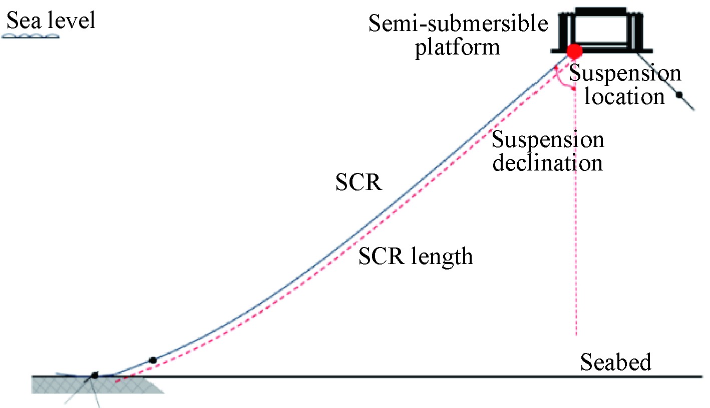 Steel catenary riser represents the pioneering riser technology implemented in China’s deep-sea oil and gas operations. Given the complex mechanical conditions of the riser, extensive research has been conducted on its dynamic analysis and structural design. This study investigates a deep-sea oil and gas field by developing a coupled model of a semi-submersible platform and steel catenary riser to analyze it mechanical behavior under extreme marine conditions. Through multi-objective optimization methodology, the study compares and analyzes suspension point tension and touchdown point stress under various conditions by modifying the suspension position, suspension angle, and catenary length. The optimal configuration parameters were determined: a suspension angle of 12°, suspension position in the southwest direction of the column, and a catenary length of approximately 2000 m. These findings elucidate the impact of configuration parameters on riser dynamic response and establish reasonable parameter layout ranges for adverse sea conditions, offering valuable optimization strategies for steel catenary riser deployment in domestic deep-sea oil and gas fields.