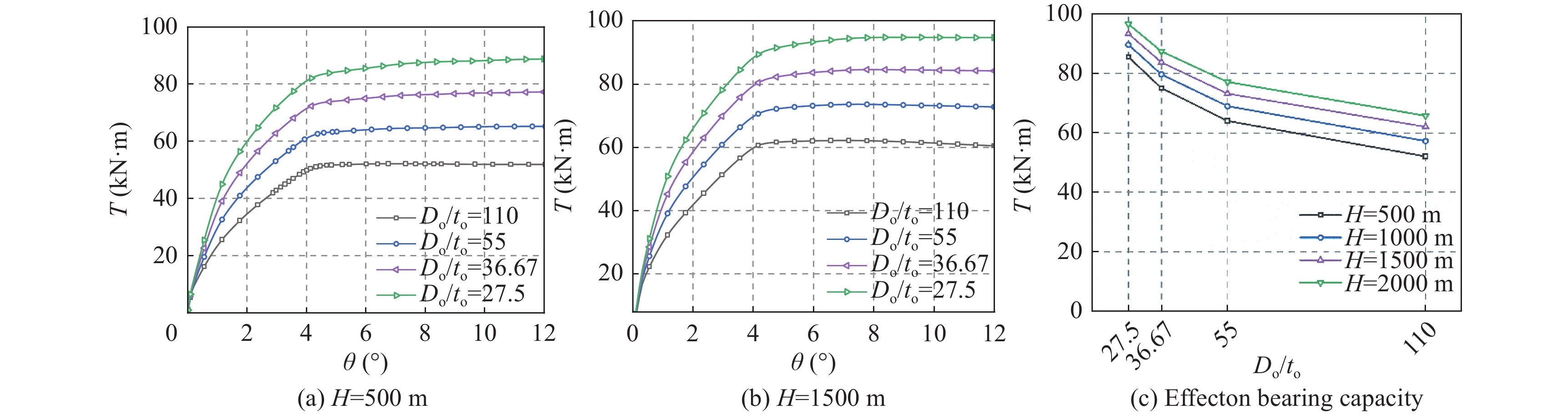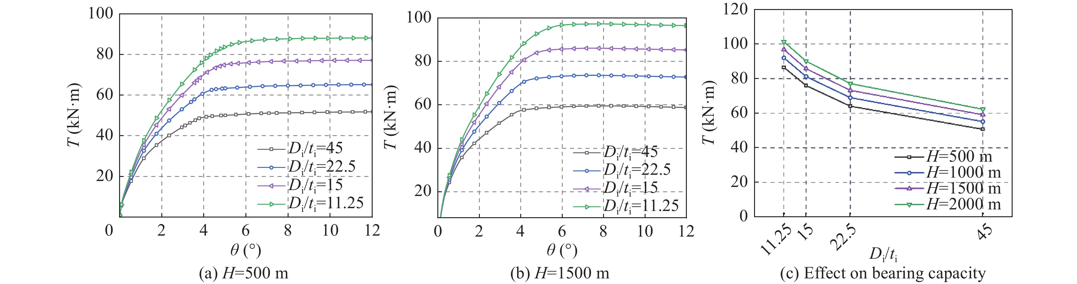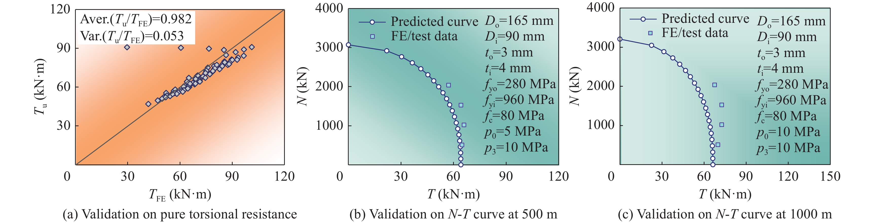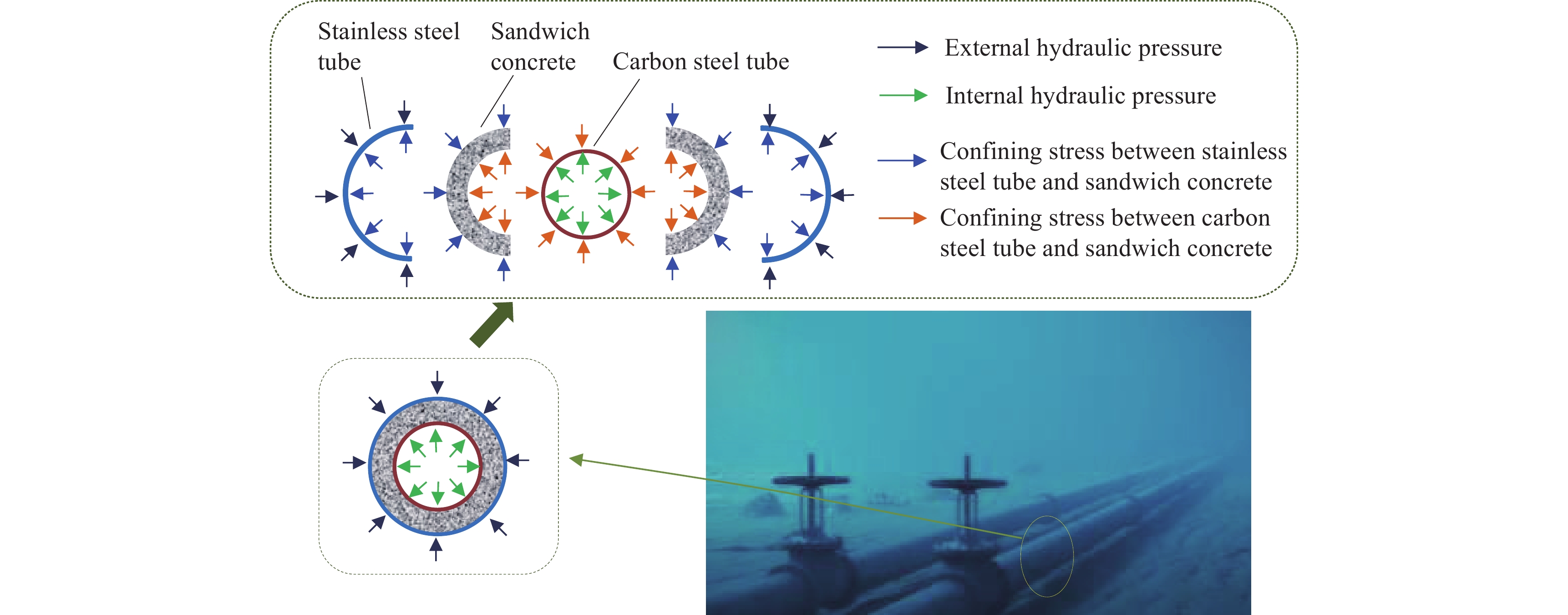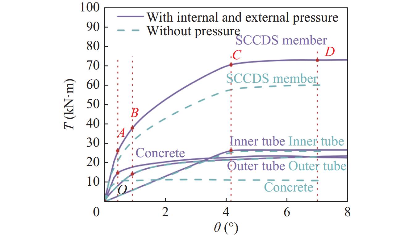 The recently developed SCCDS composite tube, a novel variant of the pipe-in-pipe (PIP) structure, demonstrates strong potential for subsea pipeline applications. However, theoretical research regarding its structural behavior under compression-torsion loading and bearing capacity calculations remains limited, particularly concerning the influence of dual hydraulic pressures during operation. This study examines the impact of dual hydraulic pressures on the compressive-torsional behavior of SCCDS composite tubes. A finite element (FE) model was developed and validated against experimental results, comparing failure modes, full-range loading curves, and bearing capacity to elucidate the working mechanism under dual pressures. A parametric study was then conducted to examine the effects of geometric-physical parameters. Results demonstrate that dual pressures substantially enhance the bearing capacity of sandwich concrete by increasing the normal contact stress at the interface. Increasing concrete strength (fc) provides minimal enhancement to torsional resistance compared to the yielding strengths of outer tube (fyo) and inner tube (fyi). Higher diameter-to-thickness ratios of outer tube (Do/to) and inner tube (Di/ti) significantly reduce torsional capacity. At 1000 m water depth, increasing the Do/to ratio from 27.5 to 36.67, 55, and 110 reduces bearing capacity by 11.17%, 23.08%, and 36.14% respectively. Strict measures should be implemented to prevent substantial reductions in strength and ductility for SCCDS composite tubes with large hollow ratios (e.g., χ=0.849) or high axial compression ratios (e.g., n=0.8). The study proposes a modified calculation method for determining N-T curves that incorporates dual hydraulic pressure effects, providing guidance for performance evaluation of novel SCCDS composite tubes in deep-sea engineering.