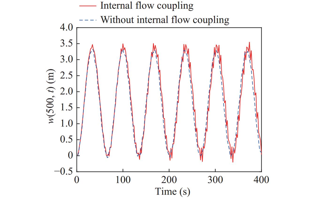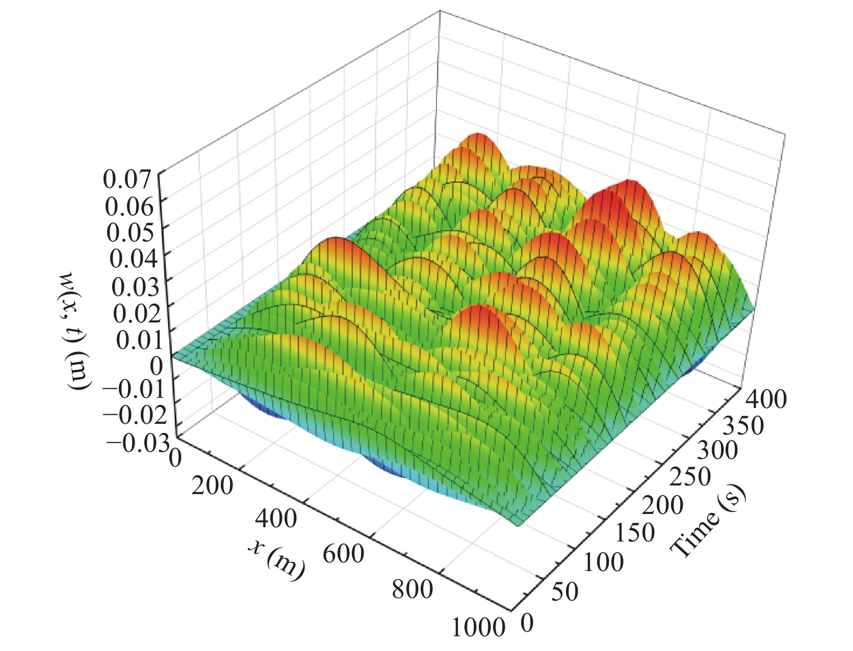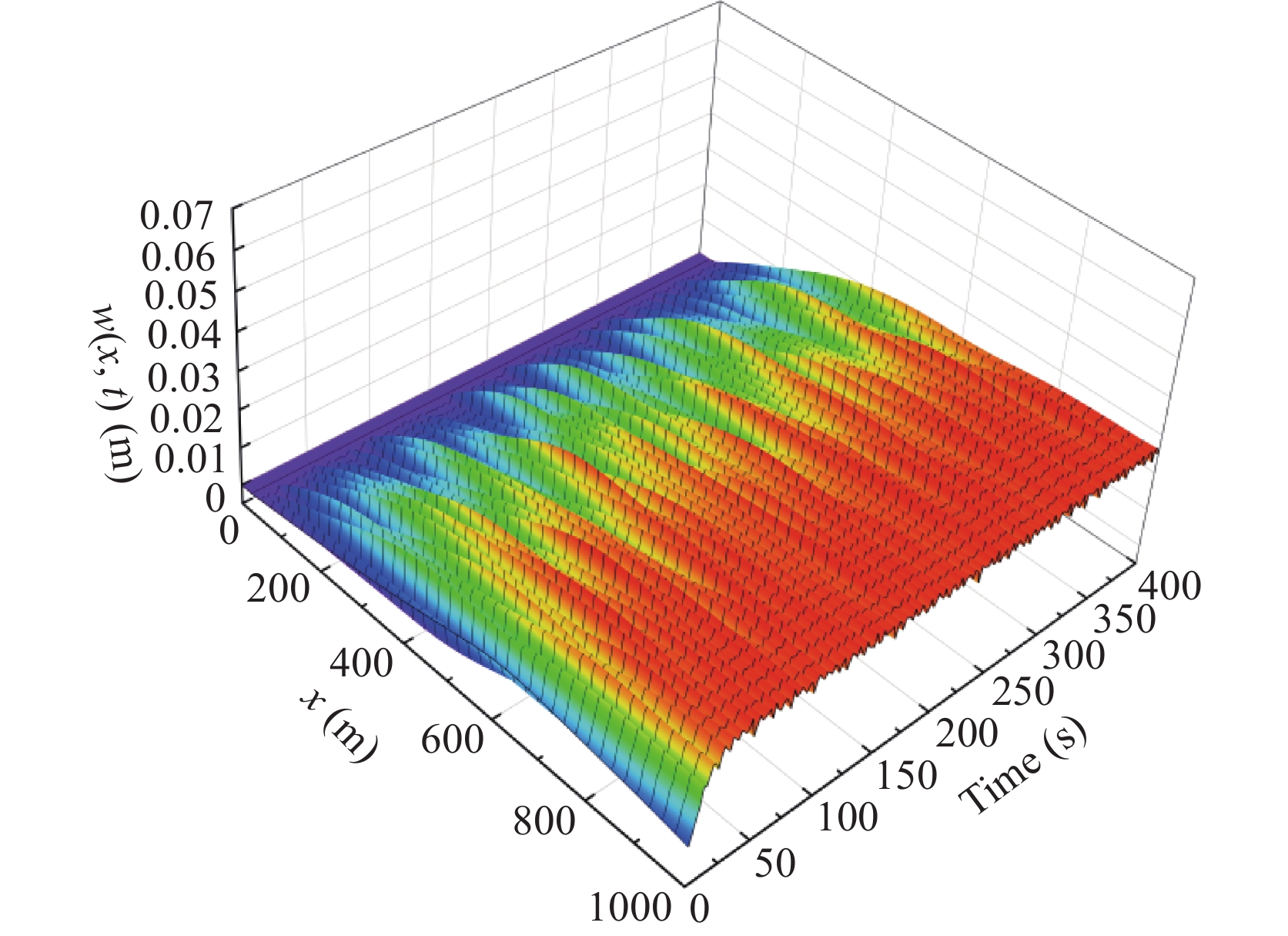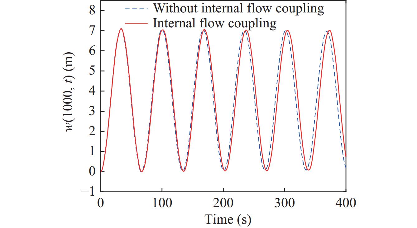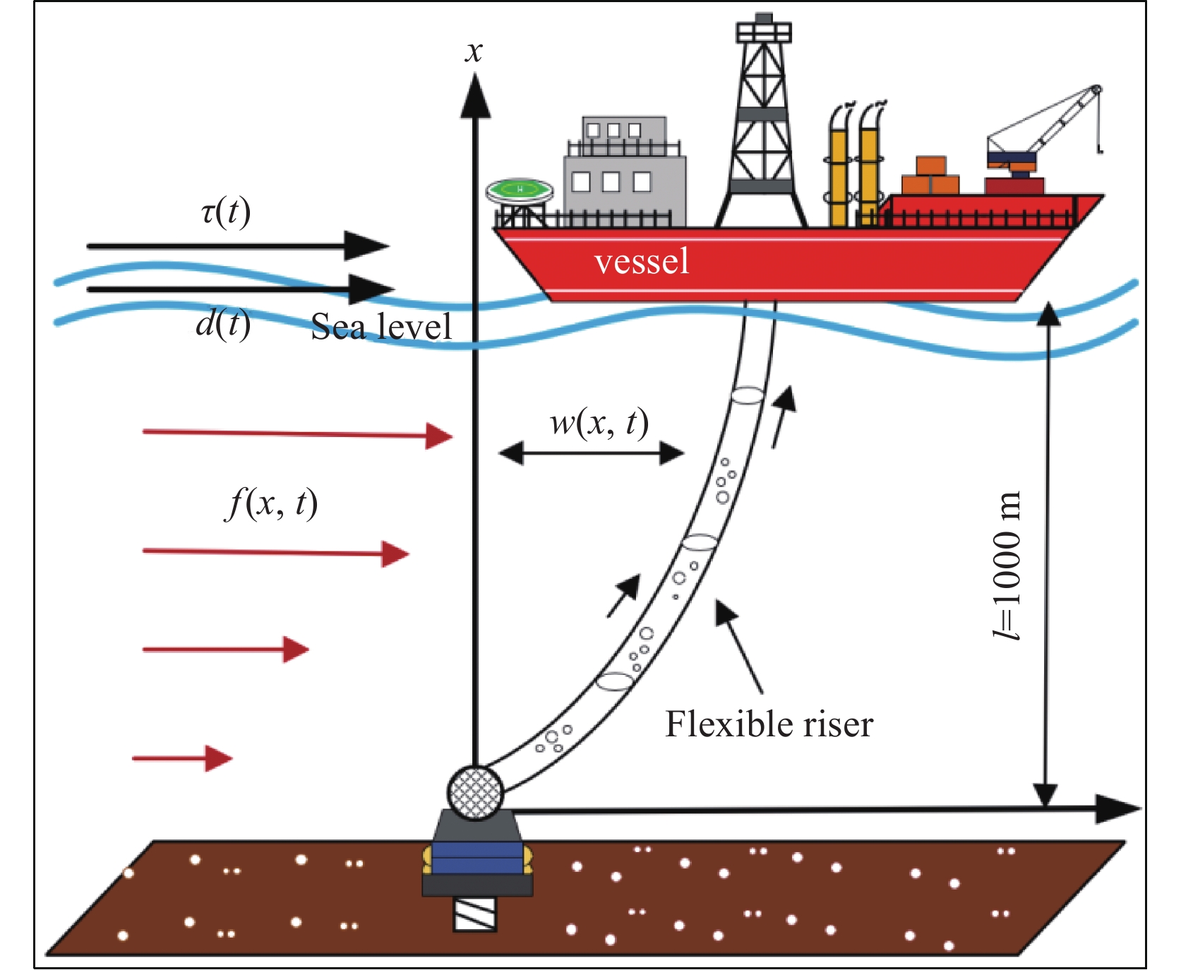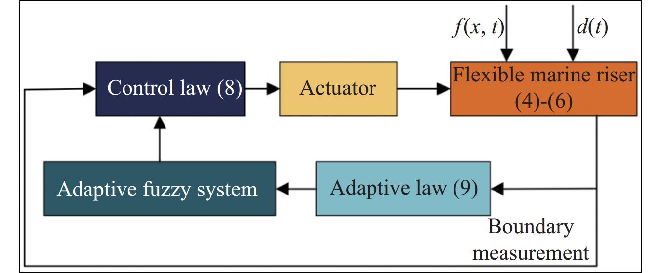 This study examines the adaptive boundary control problem of flexible marine riser with internal flow coupling. The dynamic model of the flexible marine riser system with internal flow coupling is derived using the Hamiltonian principle. An analysis of internal flow’s influence on the vibration characteristics of flexible marine risers is conducted. Then, for the uncertain environmental disturbance, the adaptive fuzzy logic system is introduced to dynamically approximate the boundary disturbance, and a robust adaptive fuzzy boundary control is proposed. The uniform boundedness of the closed-loop system is proved based on Lyapunov theory. The well-posedness of the closed-loop system is proved by operator semigroup theory. The proposed control’s effectiveness is validated through comparison with existing control methods.