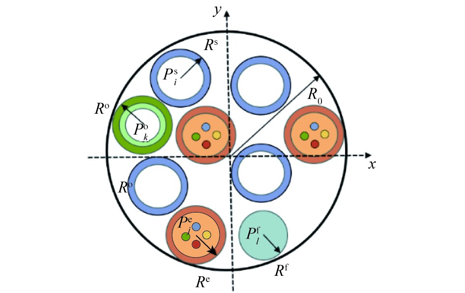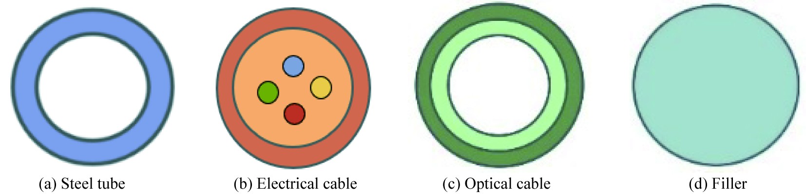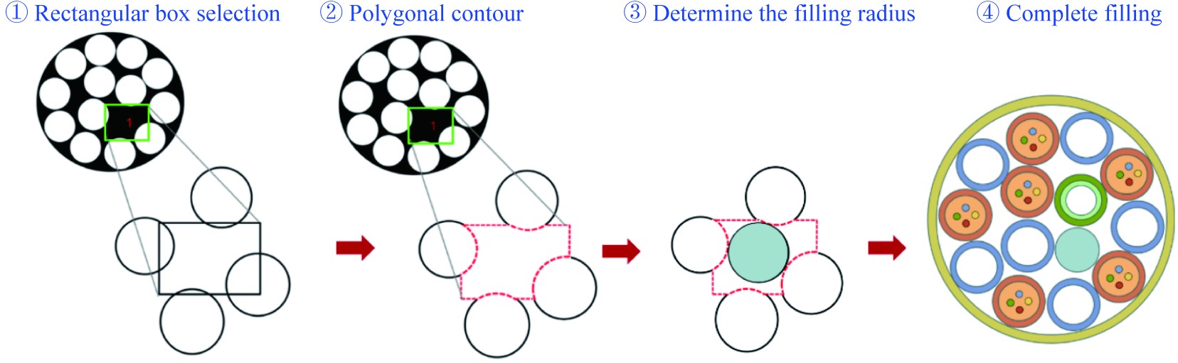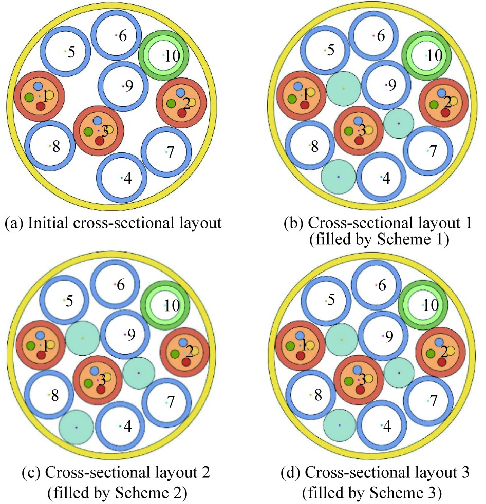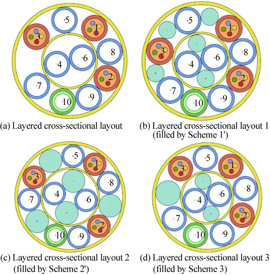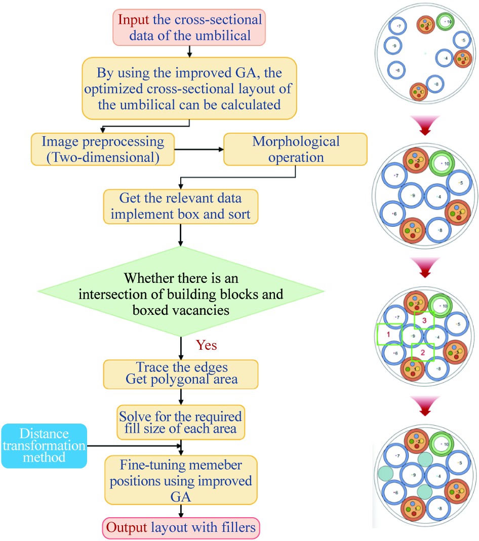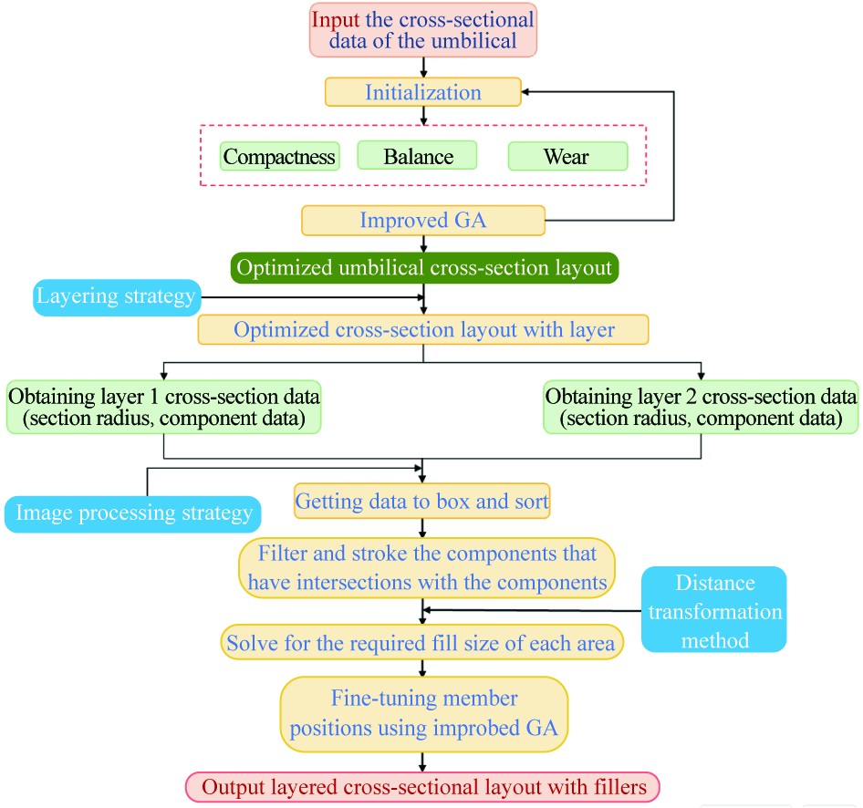 The umbilical, a key component in offshore energy extraction, plays a vital role in ensuring the stable operation of the entire production system. The extensive variety of cross-sectional components creates highly complex layout combinations. Furthermore, due to constraints in component quantity and geometry within the cross-sectional layout, filler bodies must be incorporated to maintain cross-section performance. Conventional design approaches based on manual experience suffer from inefficiency, high variability, and difficulties in quantification. This paper presents a multi-level automatic filling optimization design method for umbilical cross-sectional layouts to address these limitations. Initially, the research establishes a multi-objective optimization model that considers compactness, balance, and wear resistance of the cross-section, employing an enhanced genetic algorithm to achieve a near-optimal layout. Subsequently, the study implements an image processing-based vacancy detection technique to accurately identify cross-sectional gaps. To manage the variability and diversity of these vacant regions, the research introduces a multi-level filling method that strategically selects and places filler bodies of varying dimensions, overcoming the constraints of uniform-size fillers. Additionally, the method incorporates a hierarchical strategy that subdivides the complex cross-section into multiple layers, enabling layer-by-layer optimization and filling. This approach reduces manufacturing equipment requirements while ensuring practical production process feasibility. The methodology is validated through a specific umbilical case study. The results demonstrate improvements in compactness, balance, and wear resistance compared with the initial cross-section, offering novel insights and valuable references for filler design in umbilical cross-sections.